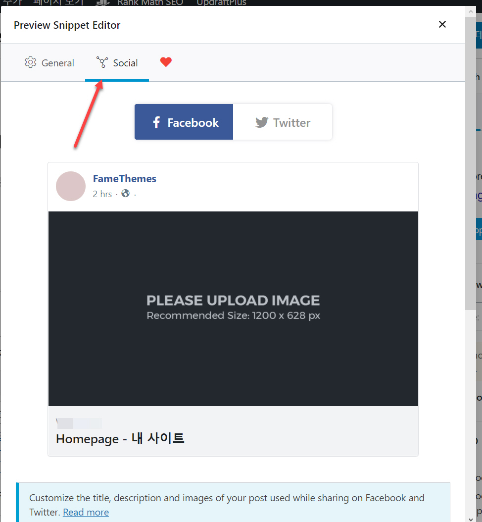 마찬가지로 Social 탭을 클릭하여 페이스북 등 SNS에 공유할 때 표시할 제목과 설명을 지정할 수 있습니다.