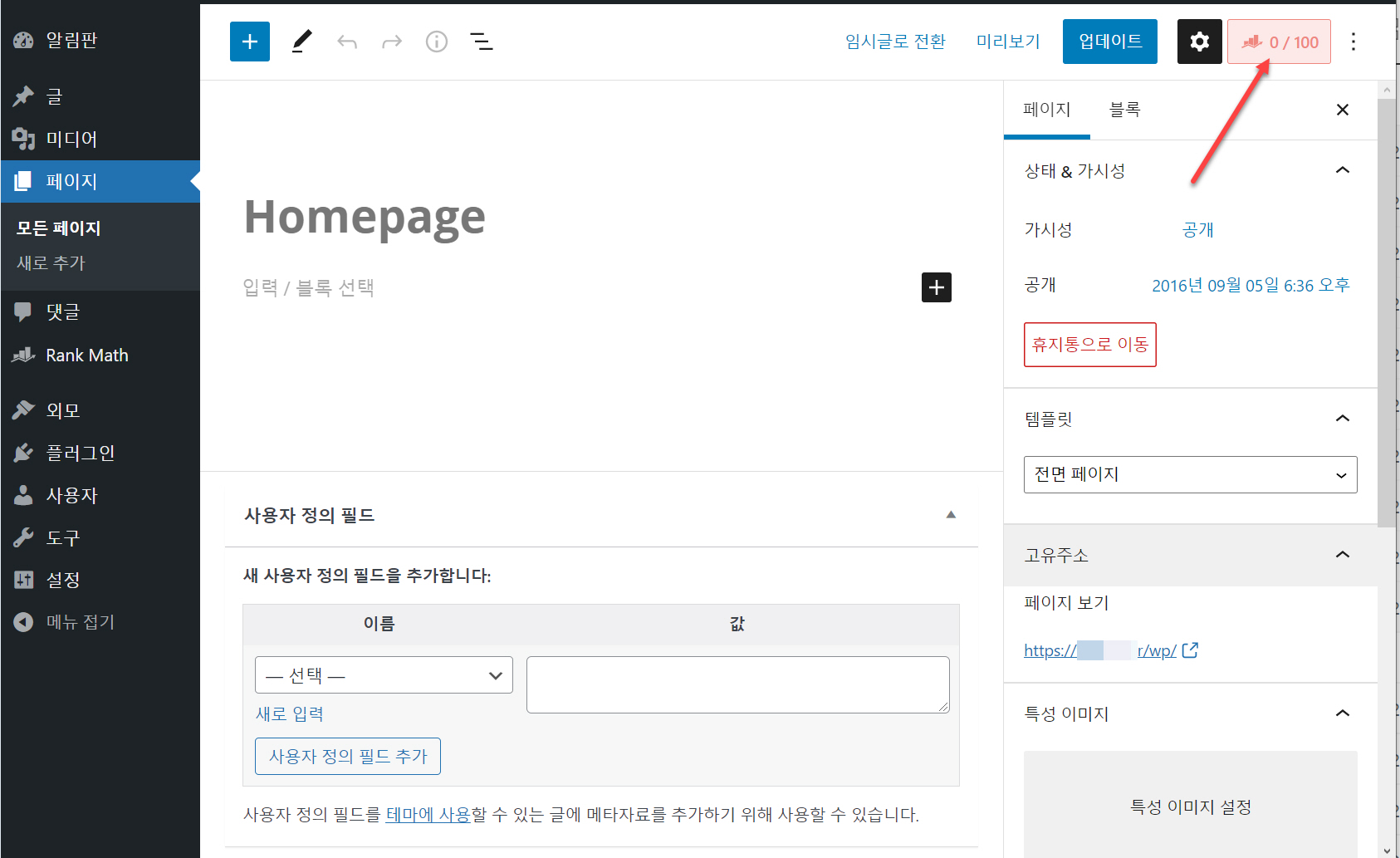 아래와 같이 페이지 편집 화면이 표시되면 오른쪽 상단의 표시된 부분(SEO 점수가 표시되는 부분)을 클릭합니다.