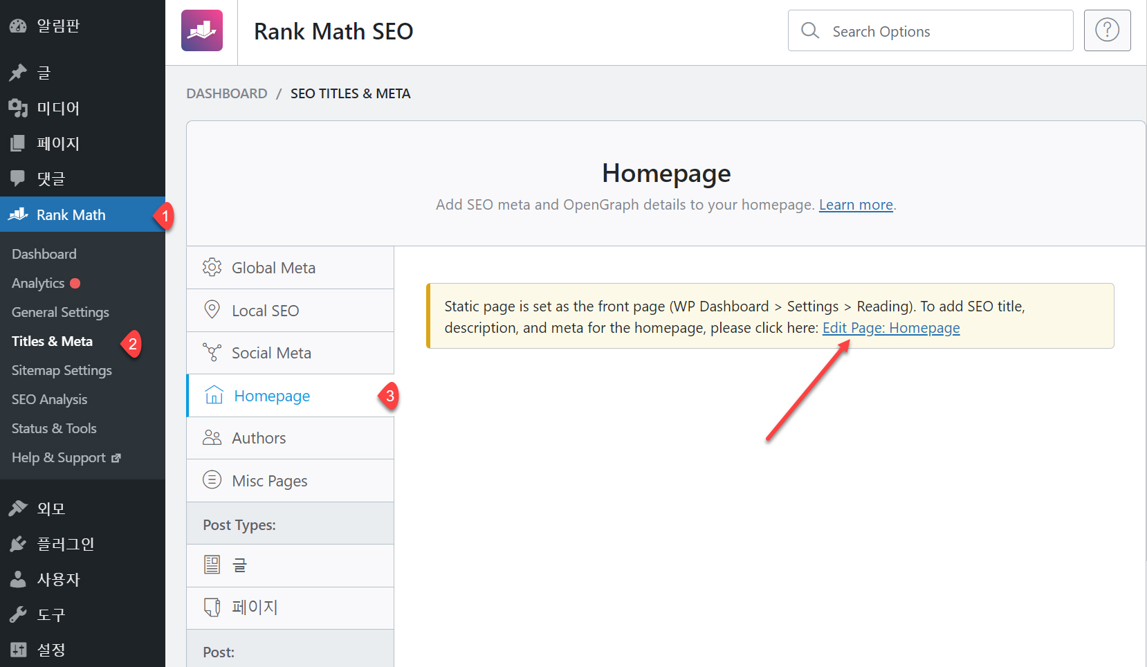 Rank Math > Titles & Meta로 이동하여 Homepage 메뉴를 클릭하면 위의 그림과는 조금 다르게 다음과 같이 "Static page is set as the front page (WP Dashboard > Settings > Reading). To add SEO title, description, and meta for the homepage, please click here: Edit Page: Homepage"가 표시됩니다.