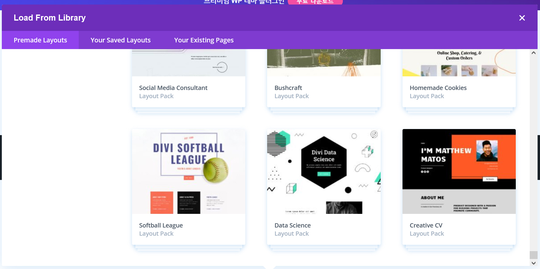 Divi 테마 개발사인 Elegant Themes에서는 매주 새로운 레이아웃 팩을 제작하여 공개하고 있습니다. 현재 225개 레이아웃 팩(총 1656개 레이아웃 페이지)을 라이브러리에서 로드하여 사용할 수 있습니다.
