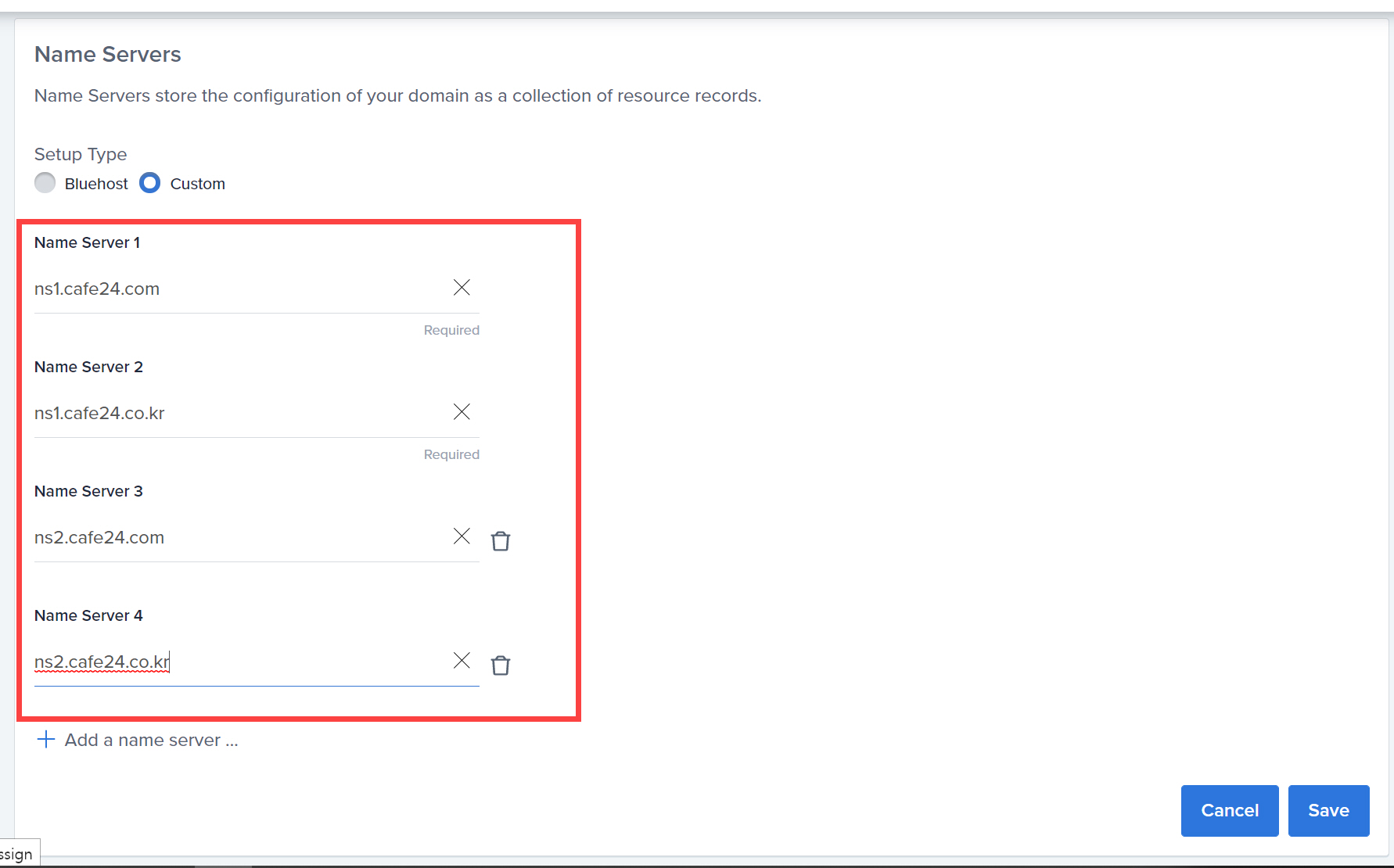 Name Server 1, Name Server 2를 입력한 다음, 필요한 경우 Add a name server ...를 클릭하여 Name Sever 3과 Name Server 4까지 모두 입력합니다.