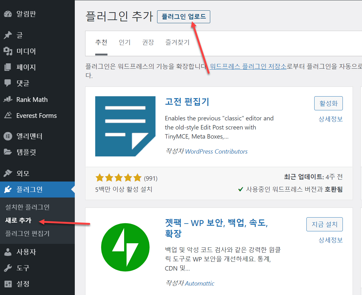 엘리멘토 프로를 설치할 워드프레스 사이트에서 플러그인 > 새로 추가를 클릭하고 상단의 플러그인 업로드를 클릭합니다.