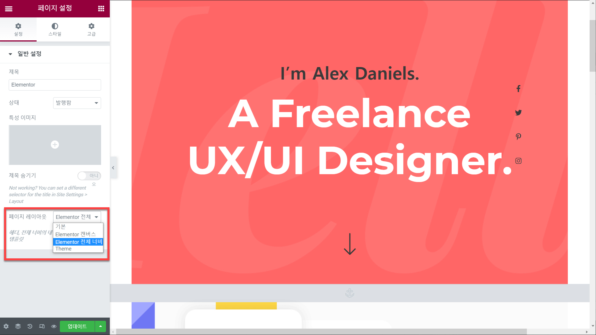 페이지 레이아웃에서 Elementor 캔버스나 Elementor 전체 너비 등으로 변경할 수 있습니다.