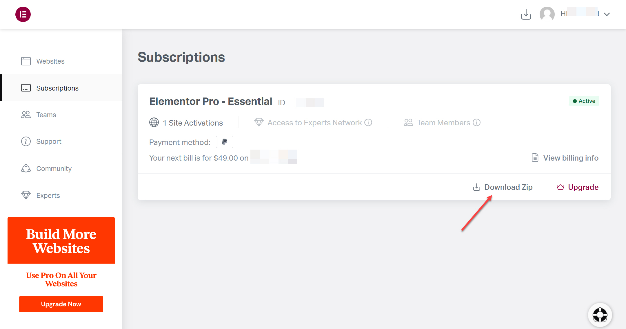 Elementor Pro 설치 파일은 처음 엘리멘터 프로를 구입한 직후에 다운로드하거나 엘리멘터 홈페이지에 로그인하여 Subscriptions (구독) 메뉴에서 다운로드할 수 있습니다.
