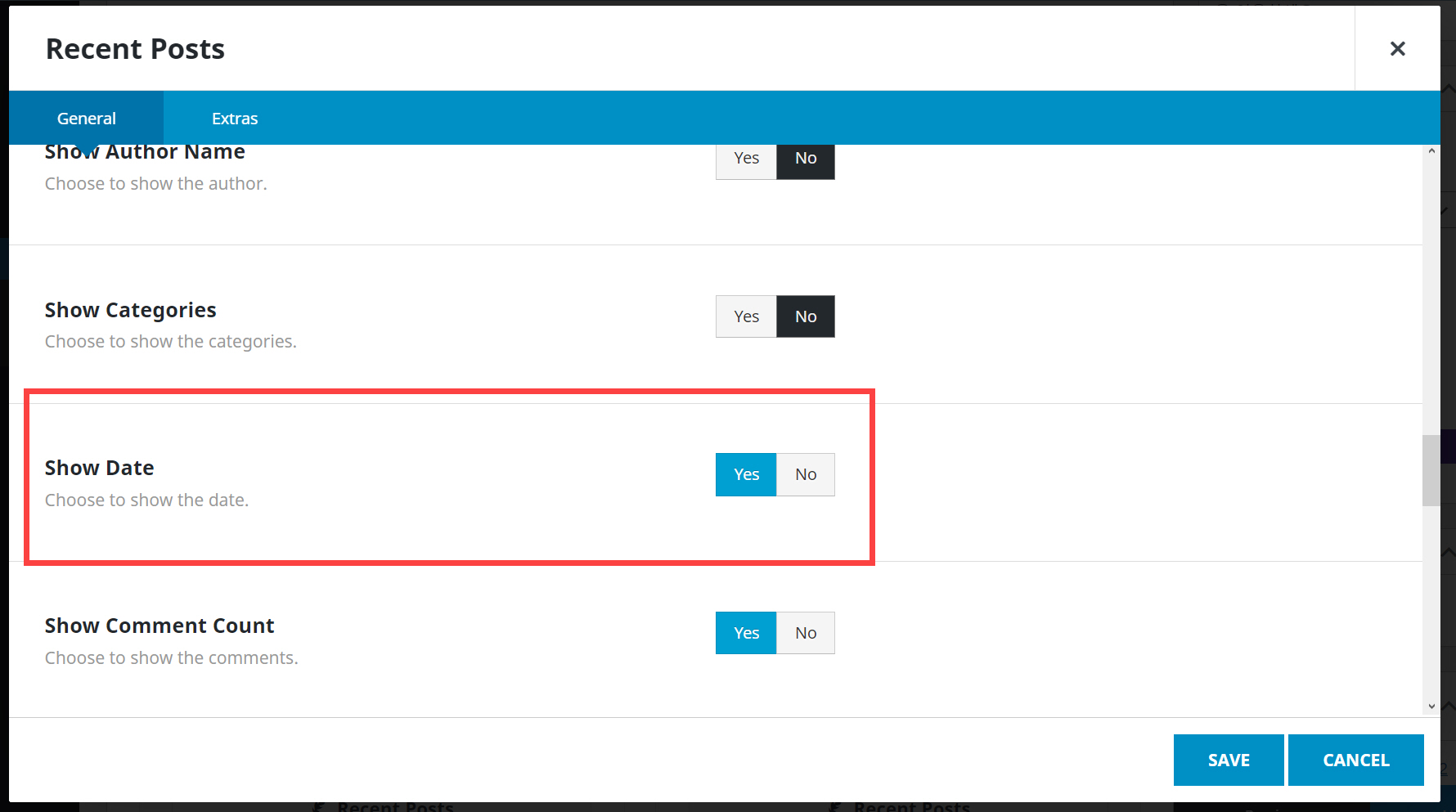 아바다 빌더의 Blog 또는 Recent Posts 엘리먼트를 사용하여 블로그 글을 표시하는 경우에는 해당 엘리먼트 설정에서 날짜를 표시하거나 숨길 수 있습니다.