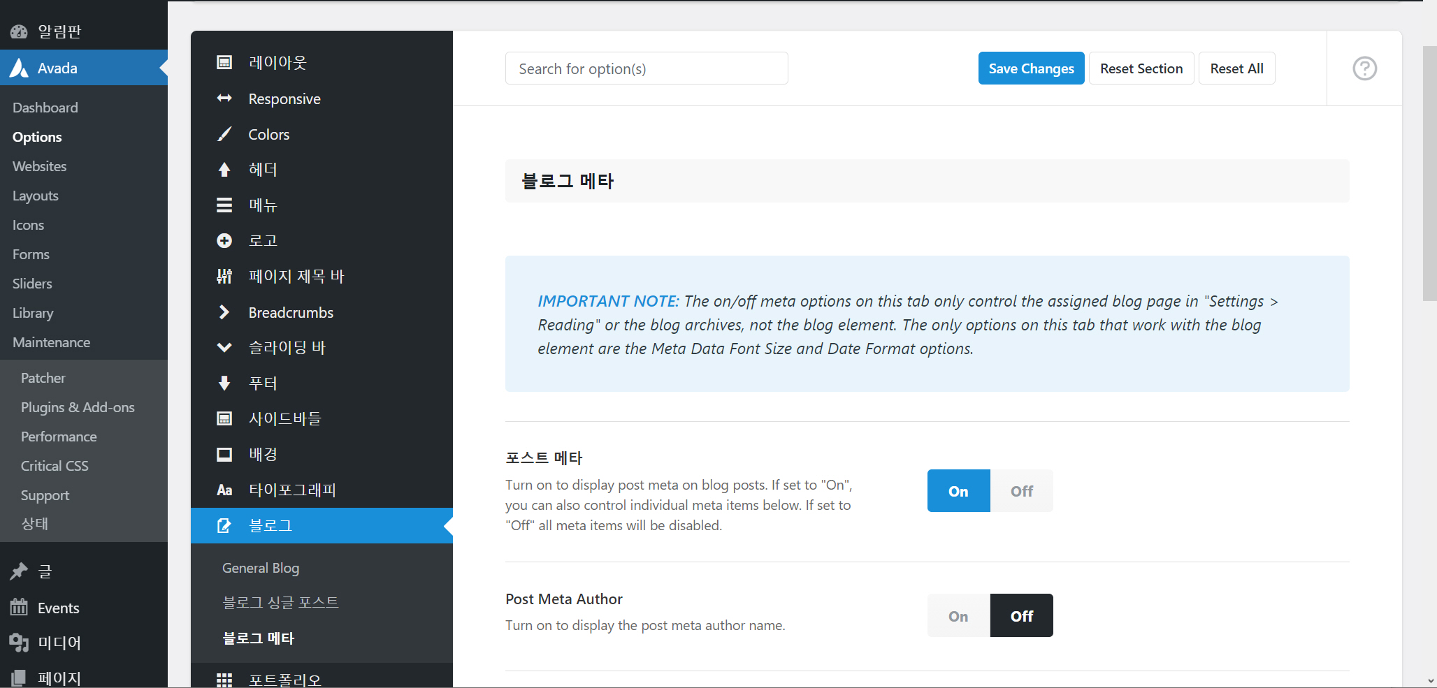 Avada 테마에서 블로그 메타 정보를 표시하거나 숨기려면 Avada > Options > 블로그 > 블로그 메타로 이동합니다.