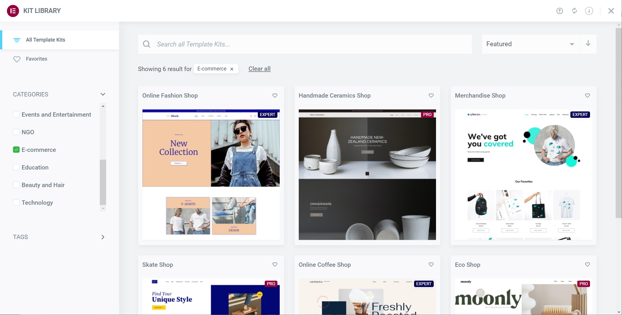 왼쪽 패널에서 카테고리나 태그 항목을 체크하여 원하는 카테고리나 키워드의 템플릿 키트를 표시할 수 있습니다. 또는, 오른쪽 상단의 Search all Template Kits... 필드에 키워드를 입력하여 검색할 수 있습니다.