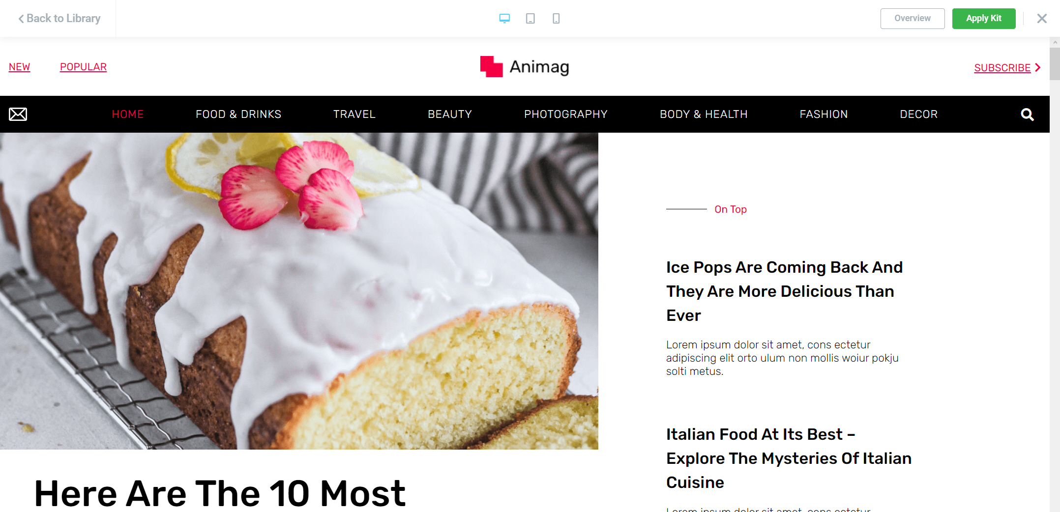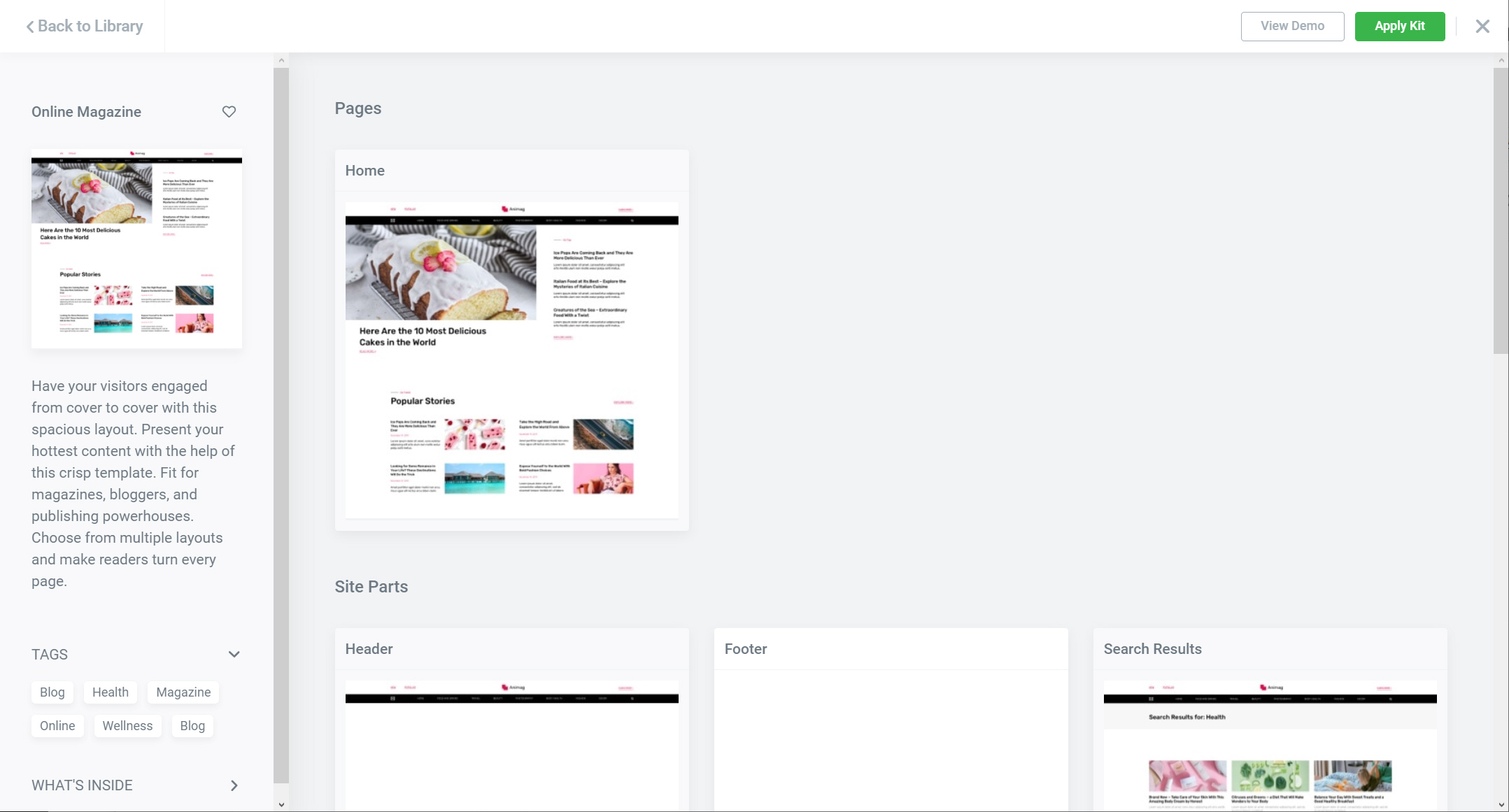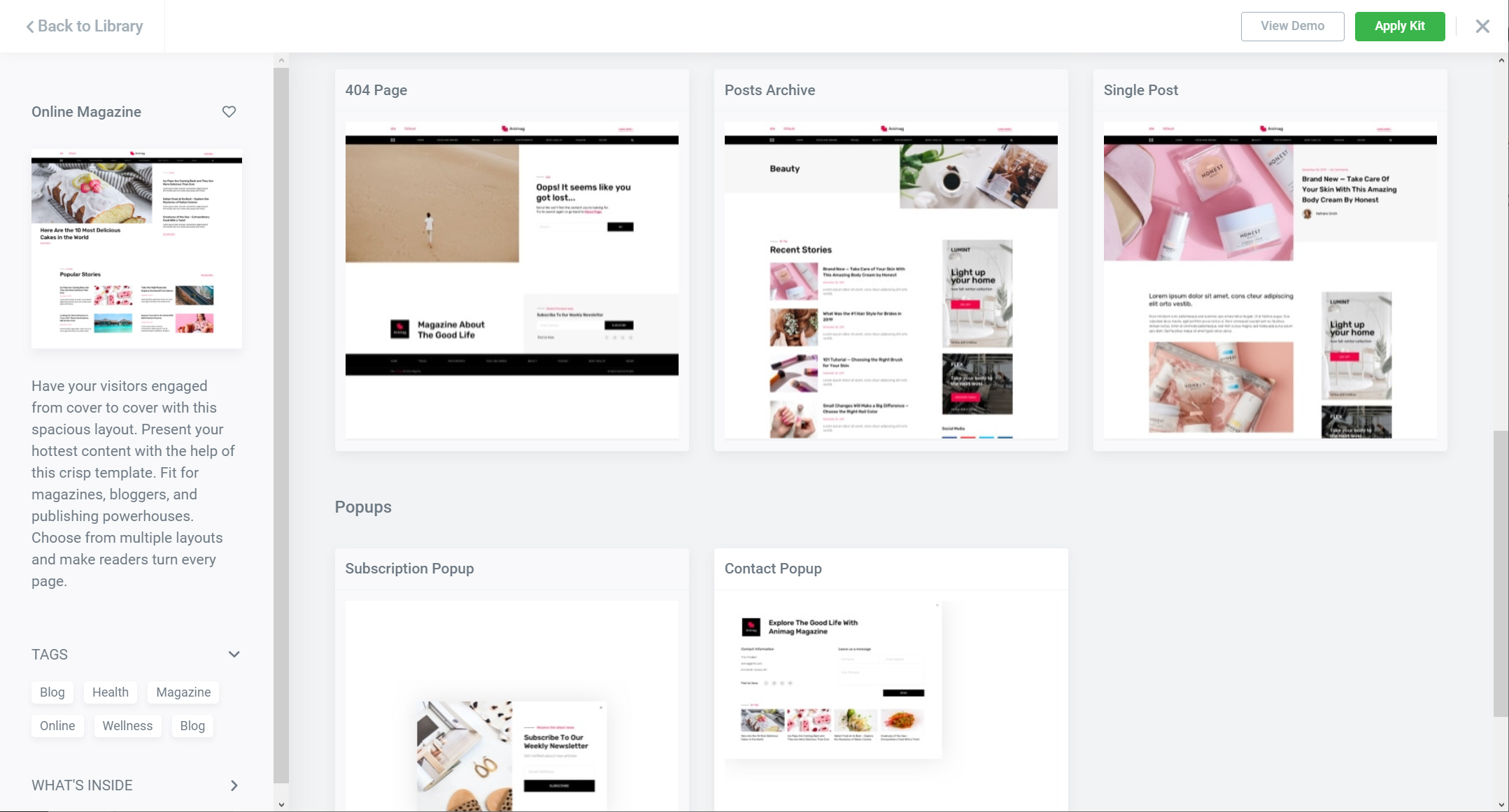 Online Magazine 키트는 1개의 페이지와 8개의 테마 빌더 템플릿(Header, Footer, Search Results, 404 Page, Posts Archive, Single Post, Subscription Popup, Contact Popup)으로 구성되어 있습니다.