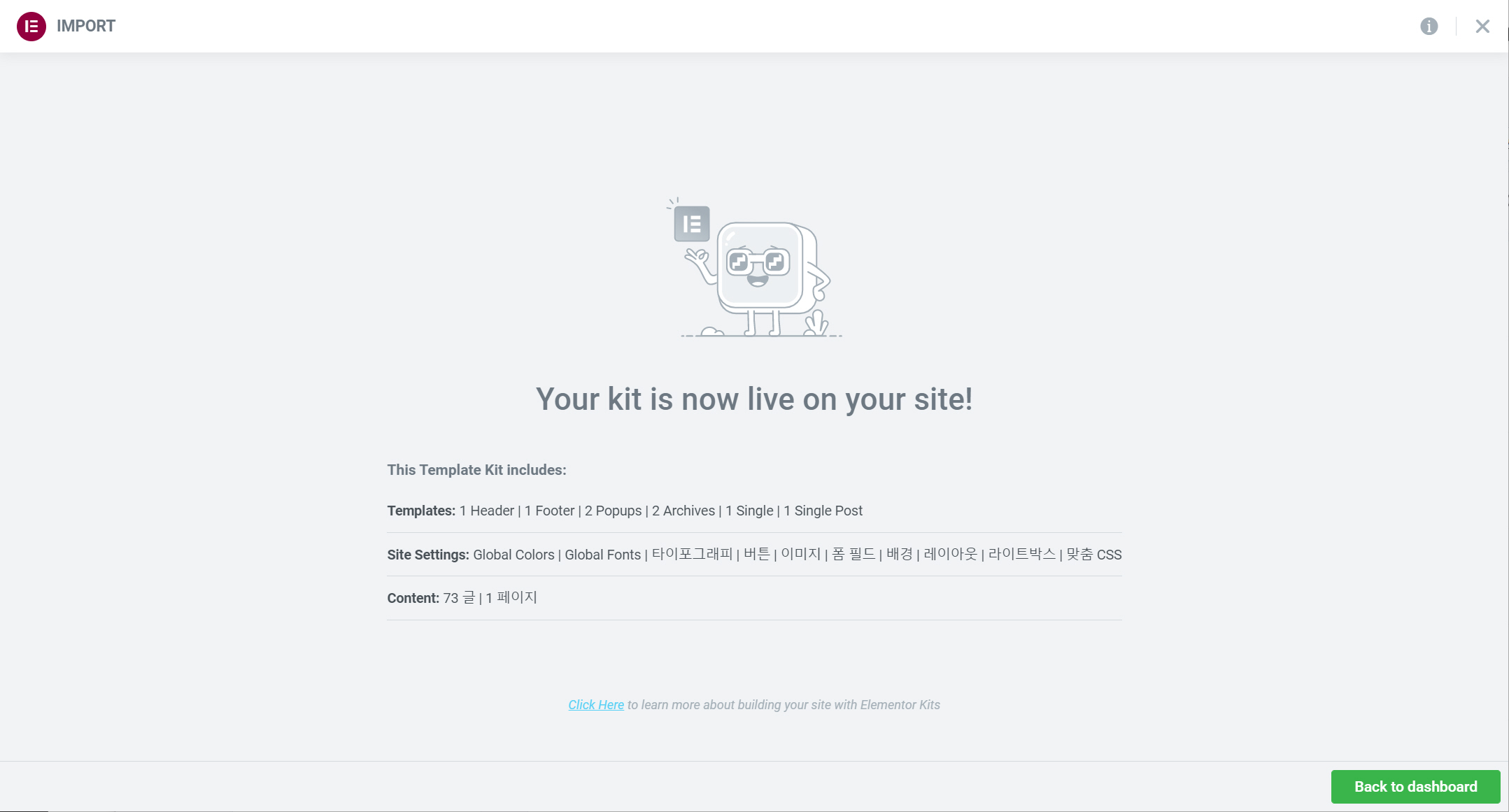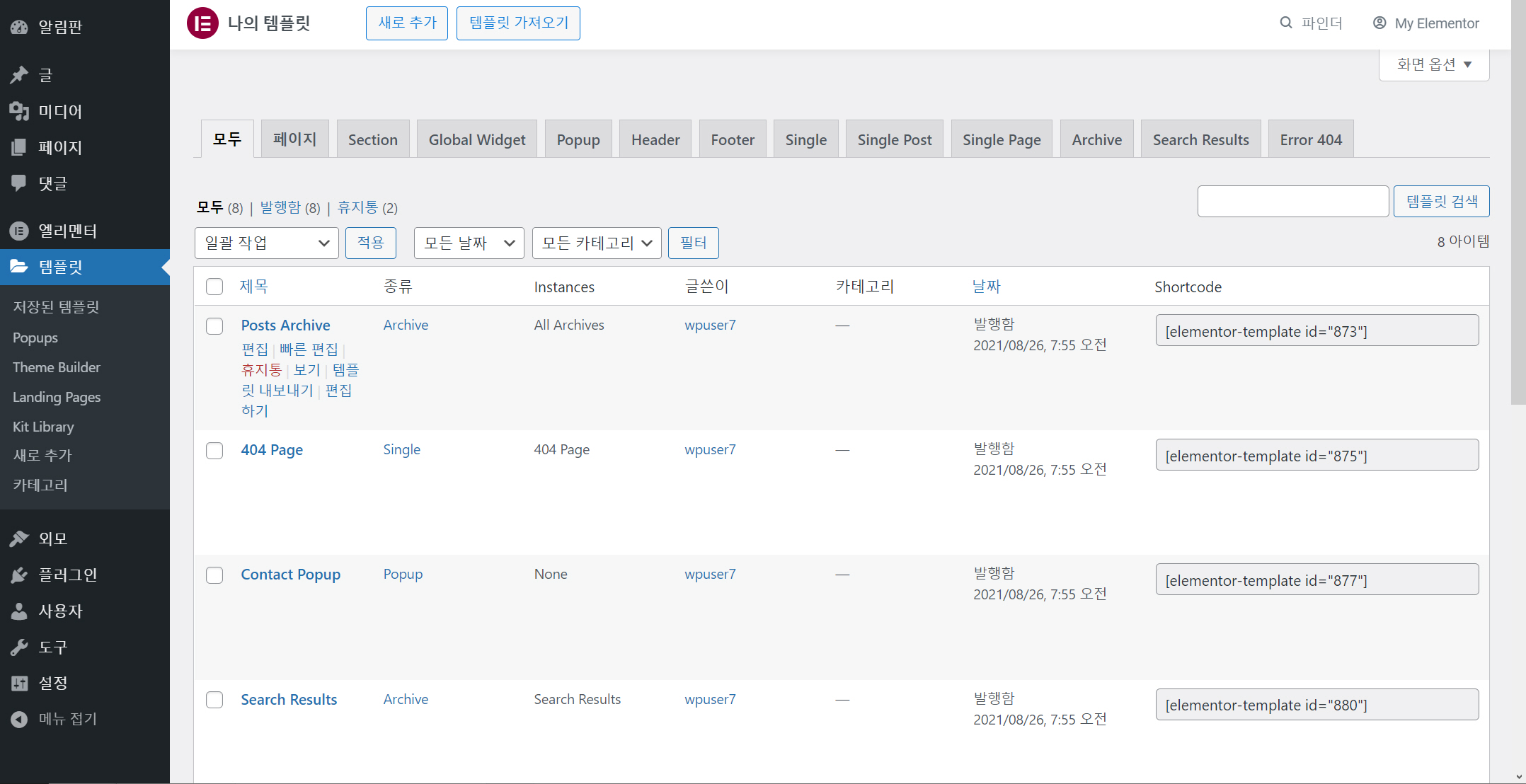 이상으로 워드프레스 엘리멘터 페이지 빌더의 Kits Library를 사용하는 방법에 대해 살펴보았습니다. 테마 빌더를 사용하여 개별적으로 헤더, 푸터, 아카이브 등의 템플릿을 만들어 사이트를 제작할 수 있는데, 키트 라이브러리는 이러한 템플릿과 페이지를 결합하여 하나의 세트로 제공하는 것으로 이해할 수 있습니다. 마음에 드는 템플릿 키트가 있다면 이 방법을 이용하면 시간과 노력을 단축할 수 있을 것입니다.