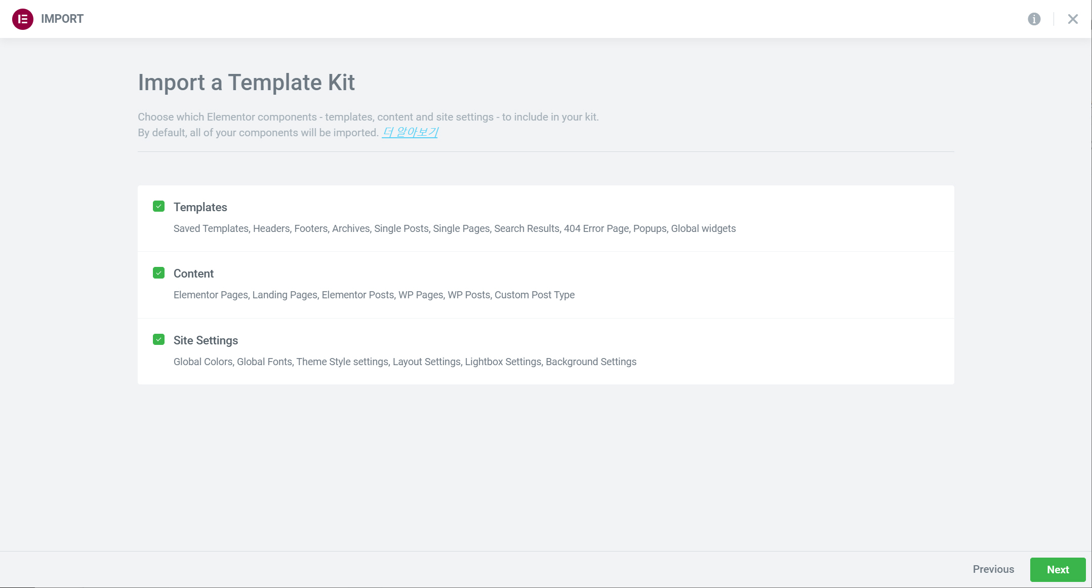 템플릿뿐만 아니라 페이지, 랜딩 페이지, 포스트(글)와 사이트 설정을 모두 가져오려면 Templates(템플릿), Content(콘텐츠), Site Settings(사이트 설정)를 모두 체크합니다.