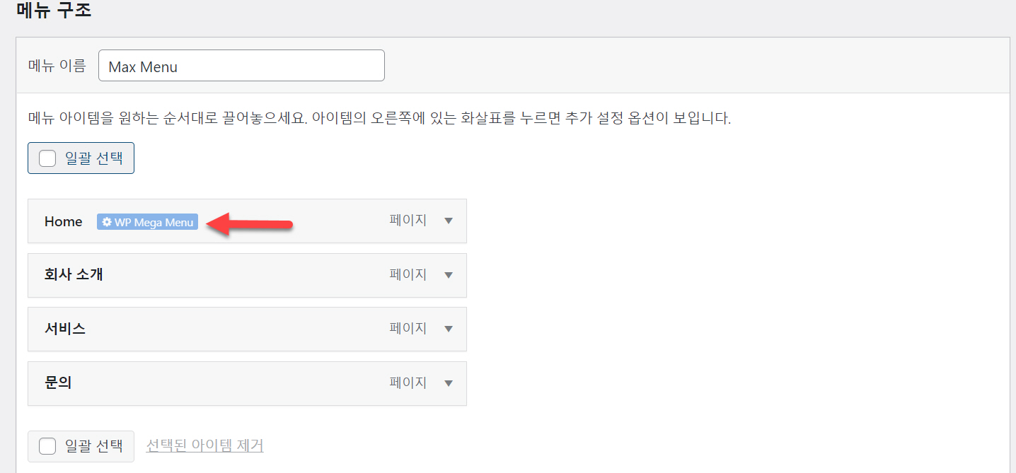 메뉴 항목 위에 마우스를 올리면 WP mega Menu 아이콘이 표시됩니다.