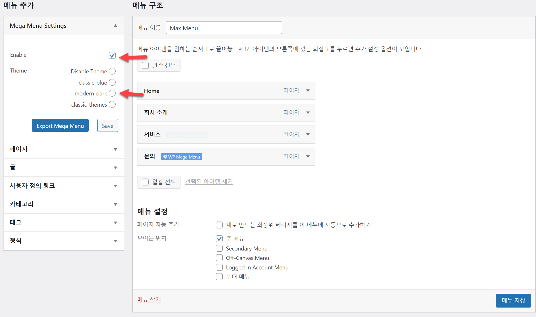 왼쪽에 Mega Menu Settigns 항목이 추가되어 있는 것을 볼 수 있습니다. Enable을 체크하고 Theme에서 원하는 메가 메뉴 테마를 선택합니다. 여기에서는 테스트로 modern-dark를 선택해보겠습니다.