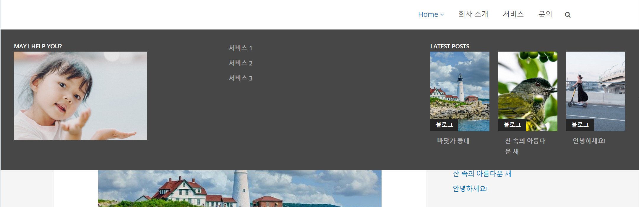 메가 메뉴 기능이 추가된 것을 확인할 수 있습니다. 하지만 메뉴 배경색, 메뉴 글자 색 등을 조정해주어야 합니다.