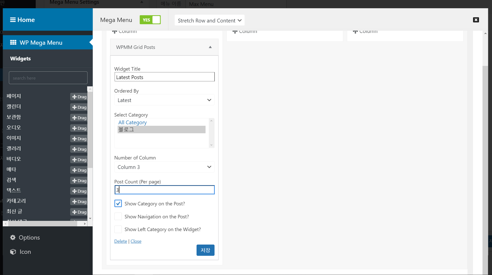 이 아이콘을 클릭합니다. Mega Menu를 Yes로 선택하고 옆의 Select Stretch 옵션을 선택합니다.