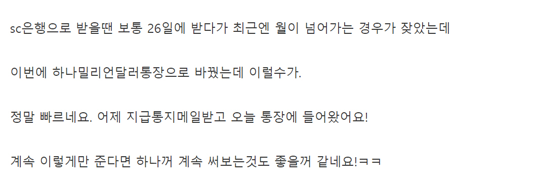 하나 밀리언달러 통장으로 애드센스 수익금을 받을 경우 다른 통장보다 빠르게 수익금이 들어온다는 평가가 있습니다. 어떤 분은 SC 은행으로 받을 땐 보통 26일경에 받다가 최근에는 다음 달로 넘어가는 경우가 잦았지만 이 통장으로 바꾼 후에는 곧바로 수익금이 들어왔다고 하네요.