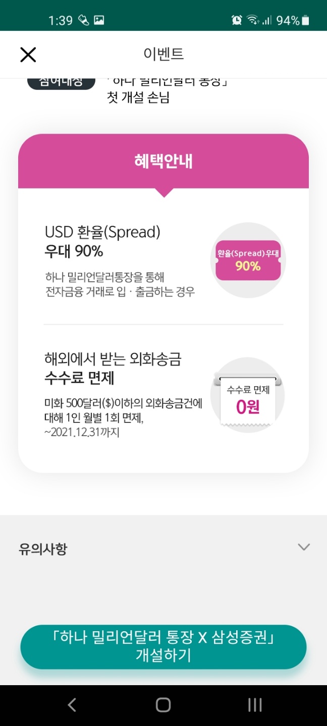 9월 30일까지 하나 밀리언달러 통장 x 삼성증권 연계계좌를 처음으로 개설하는 고객에게 최대 30달러를 제공한다고 합니다.