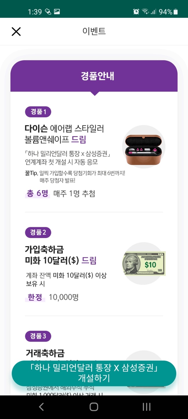 가입축하금으로 계좌 잔액 미화 10달러 이상 보유 시 10,000명에 한하여 10달러를 제공하고, 하나 밀리언달러 통장을 통해 삼성증권에서 해외주식 누적 미화 1,000달러 이상 거래 시 1000명에 한하여 20달러를 거래축하금으로 제공합니다.