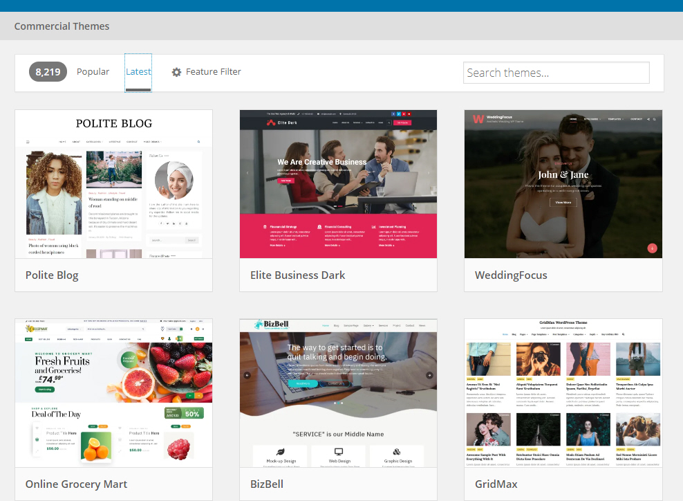 얼마나 많은 워드프레스 테마가 있을까요? 궁금해서 WordPress.og 테마 리스트를 살펴보니 Latest(최신) 리스트에 8219개 테마가 있다고 표시되네요.