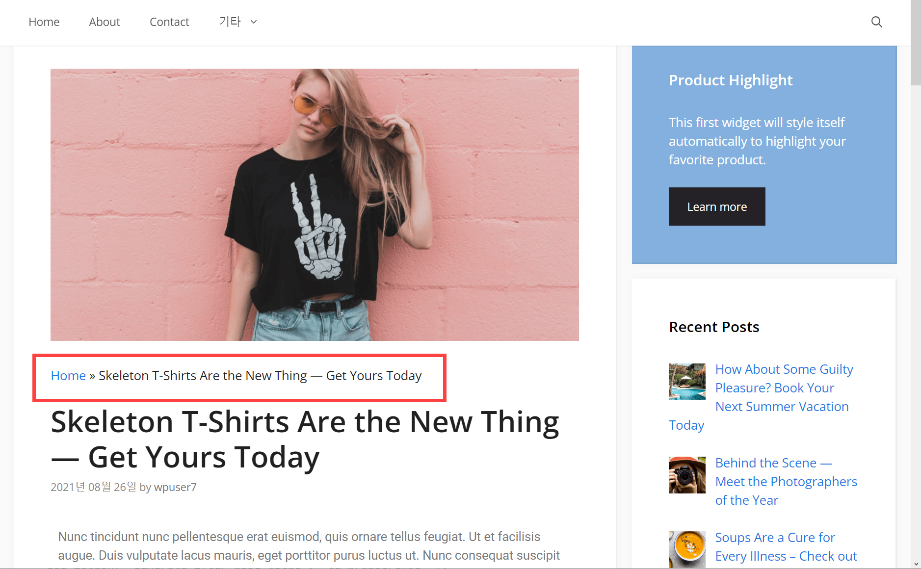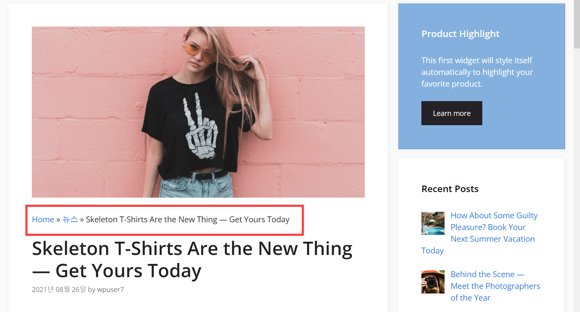 위에서는 카테고리는 브레드크럼에 표시되지 않고 있습니다. 카테고리도 표시하고 싶다면 Yoast SEO의 브레드크럼 설정 페이지에서 카테고리를 지정하시기 바랍니다.