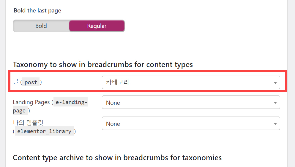 예를 들어, Taxonomy to show in breadcrumbs for content types (콘텐츠 유형에 대하여 브레드크럼에 표시할 분류) 섹션에서 글(post) 옵션에 카테고리를 선택합니다.