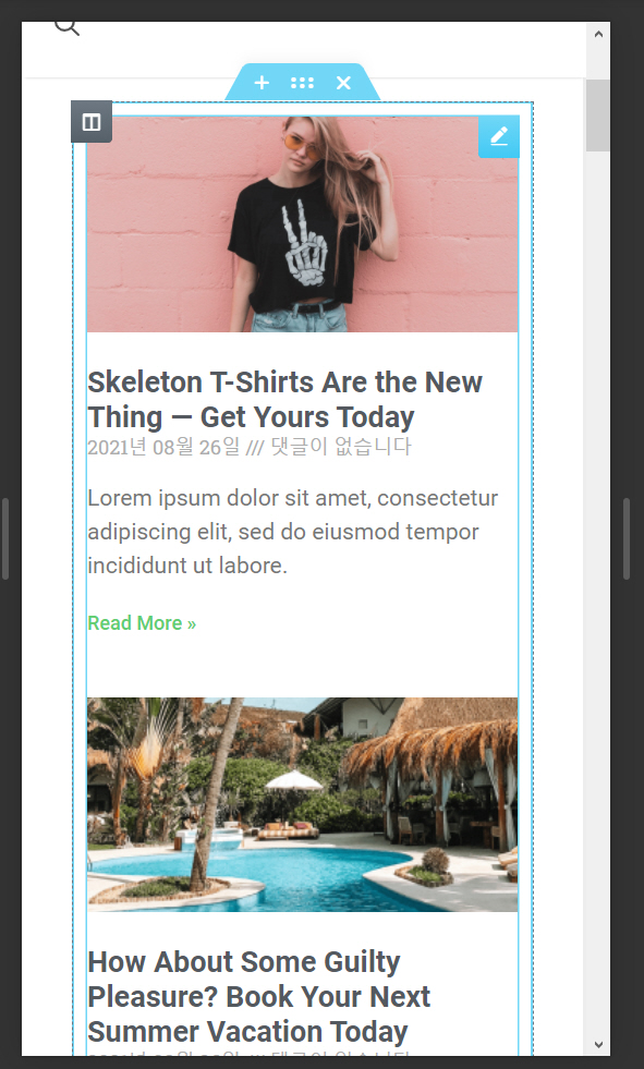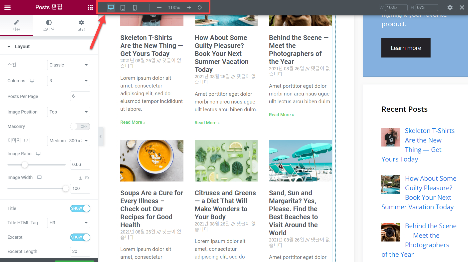 엘리멘터 페이지 빌더에서 어떤 요소를 추가하면 기기 해상도에 따라 적절히 레이아웃이 표시됩니다. 예를 들어, Elementor Website Builder의 포스트(Posts) 위젯을 추가할 경우 PC와 태블릿, 모바일에서 컬럼 개수가 다르게 표시됩니다.