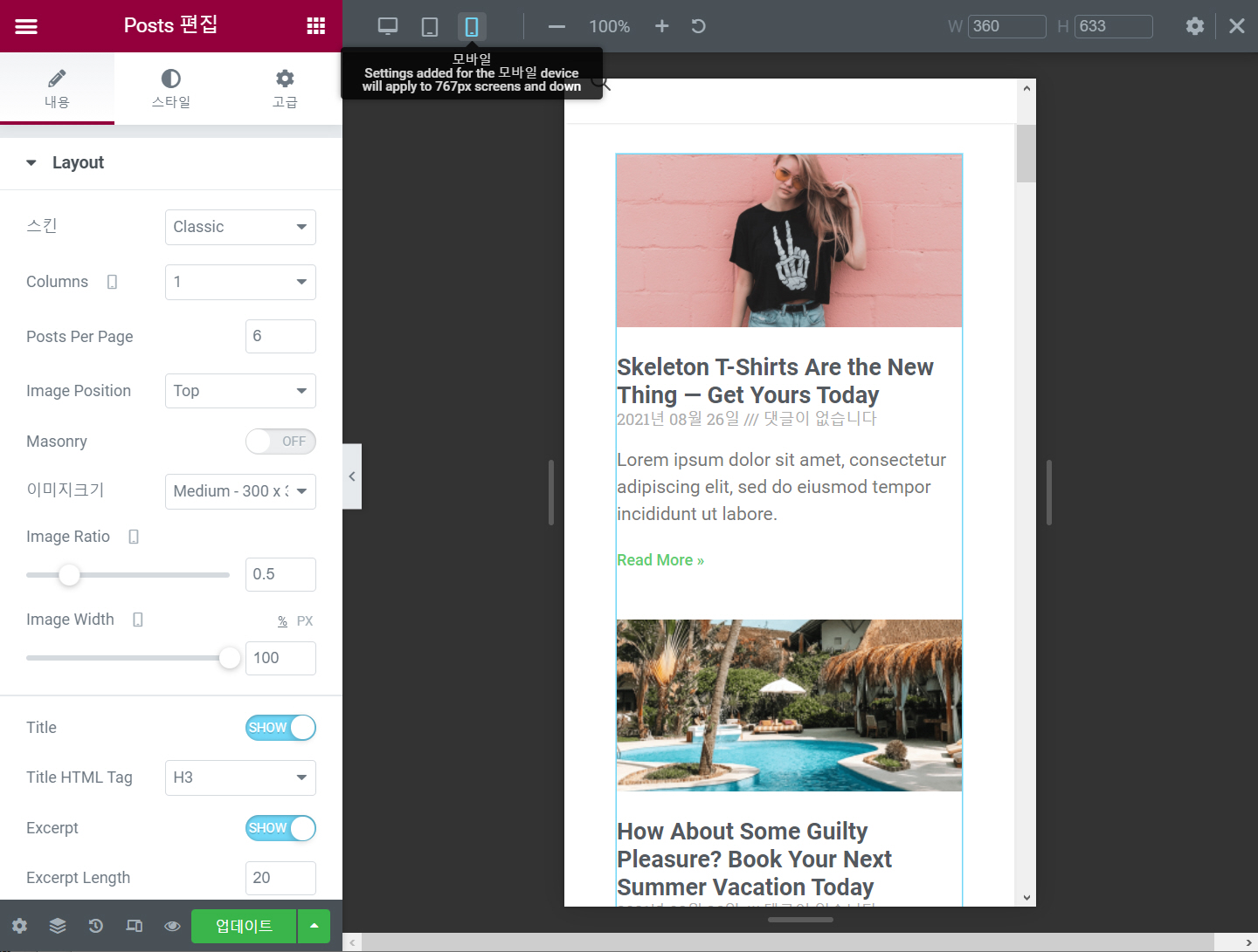 포스트가 모바일에서 1열(1 Column)로 표시되도록 설정되어 있습니다. 컬럼 개수와 페이지당 표시할 글 개수를 비롯한 각종 설정을 세부적으로 조정할 수 있습니다.