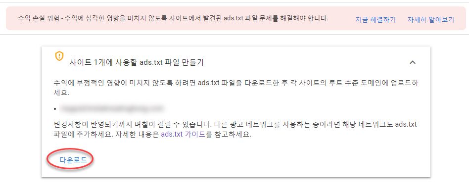 구글 애드센스 계정 페이지에 '수익 손실 위험 - 수익에 심각한 형향을 미치지 않도록 사이트에서 발견된 ads.txt 파일 문제를 해결해야 합니다' 경고가 표시되는 경우가 있습니다.