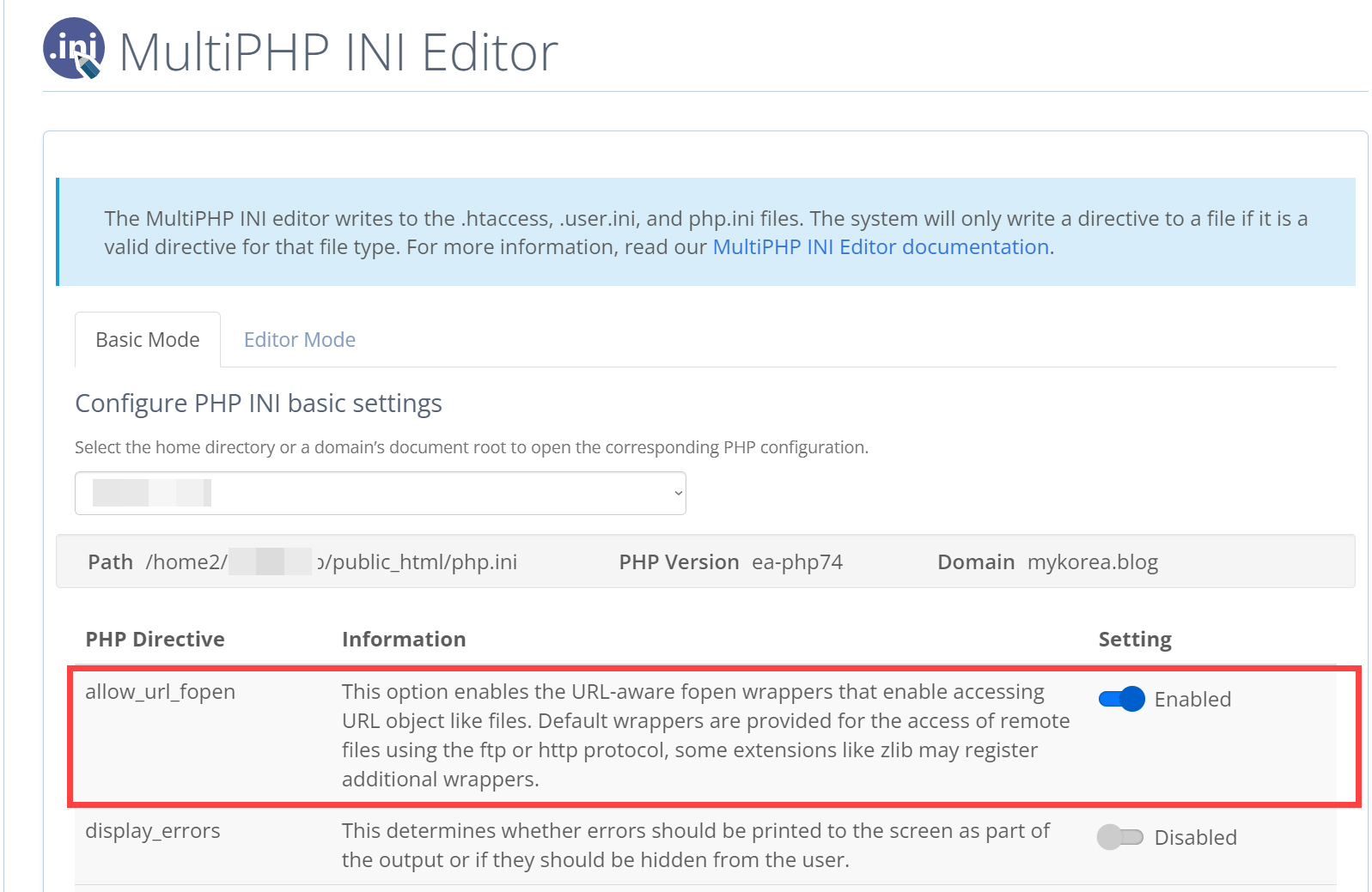Basic Mode와 Editor Mode에서 allow_url_fopen을 활성화/비활성화할 수 있습니다. Basic 모드에서 allow_url_fopen을 활성화할 수 있으면 Basic 모드에서 활성화하도록 합니다.