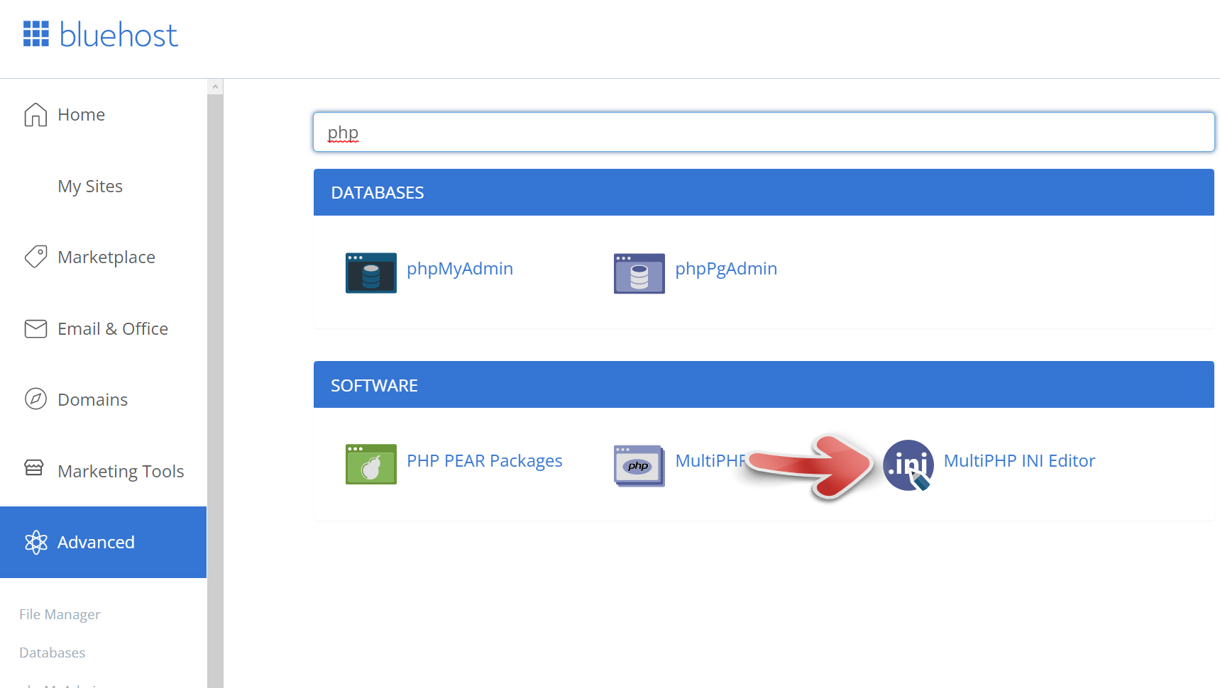 cPanel에서 'php'로 검색하여 Software 섹션 아래의 MultiPHP INI Editor 툴을 클릭합니다.