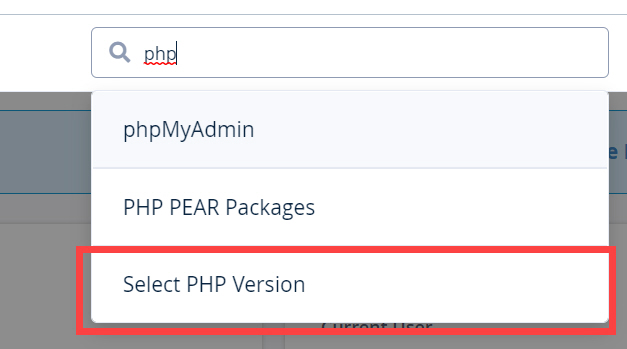 PHP 버전을 변경하려면 cPanel에 접속하여 검색 필드에 "php"를 입력한 다음, Select PHP Version 툴을 선택합니다.