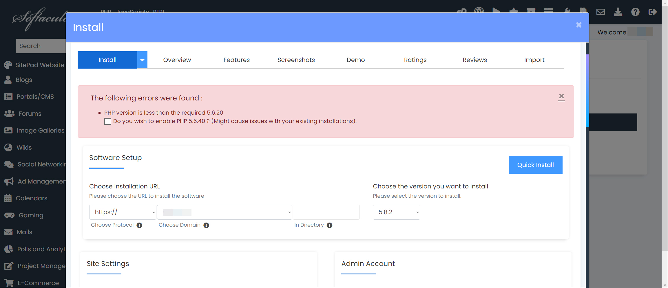 cPanel의 워드프레스 설치 툴을 사용하여 워드프레스 설치를 시도하면 위의 그림과 같이 PHP version is less than the requiered 5.6.20이라는 경고가 표시되면서 최신 버전을 설치할 수 없게 됩니다.