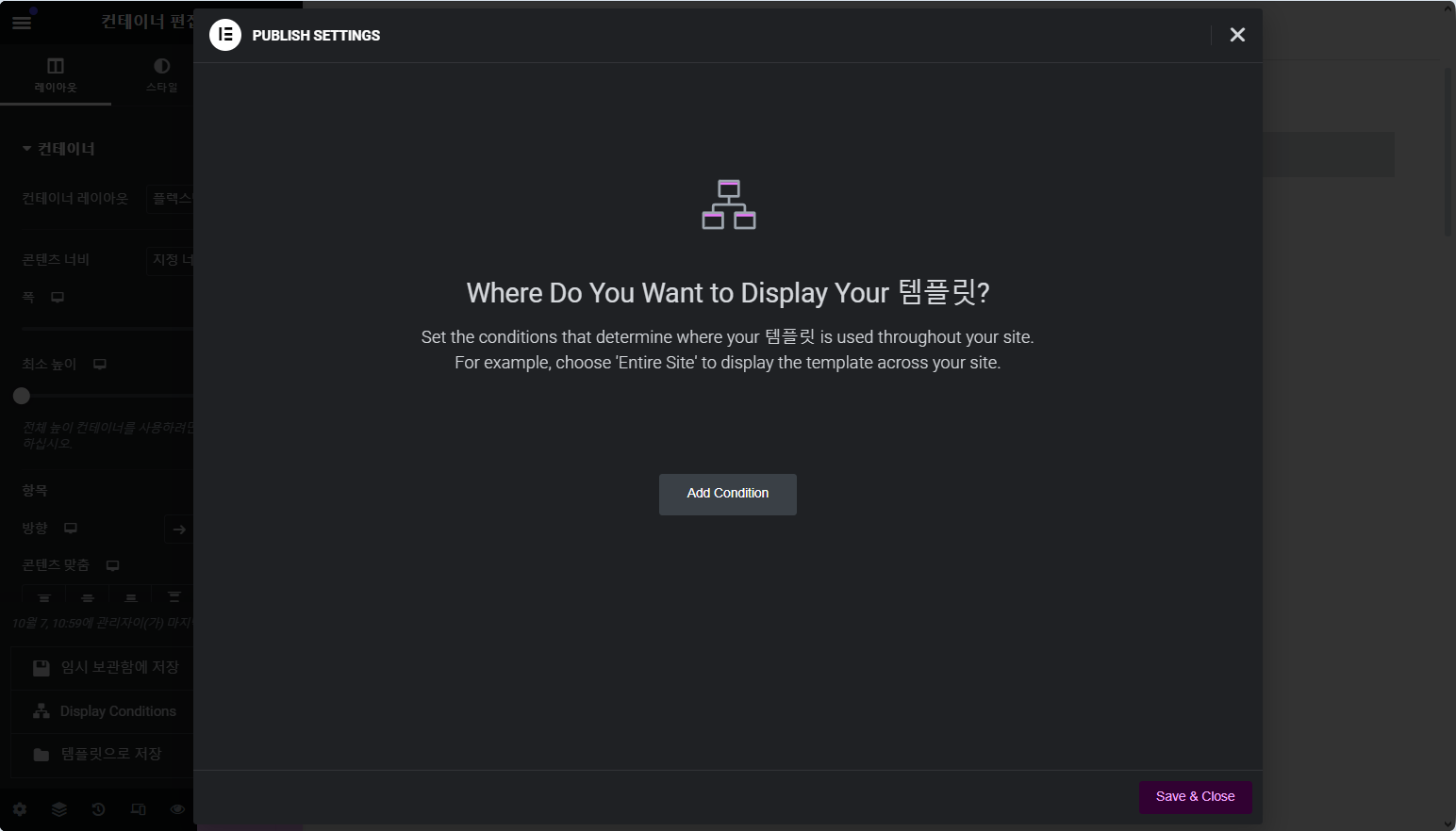Where Do You Want to Display Your Template?(템플릿을 어디에 표시하기를 원하시나요?)가 표시됩니다. Add Condition(조건 추가) 버튼을 클릭합니다. 조건은 추후에 다시 변경이 가능합니다.