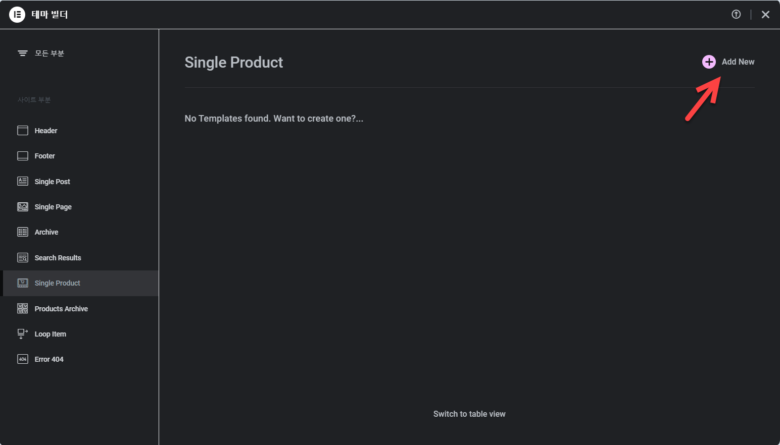 테마 빌더에서 Single Product를 선택하고 Add New를 클릭합니다.