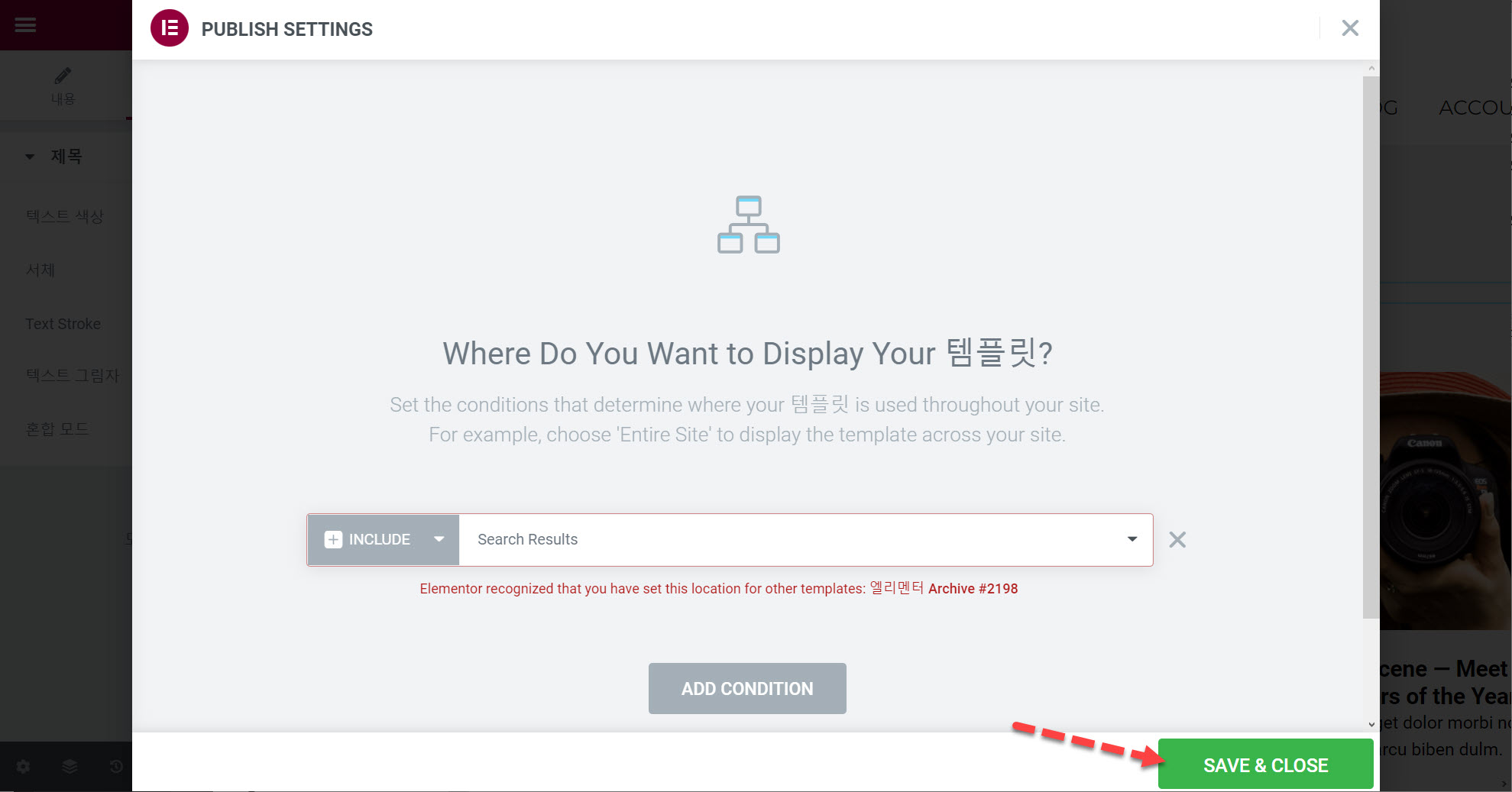 Elementor Pro에서는 Theme Builder(테마 빌더)에서 각 파트의 템플릿을 만들 수 있습니다. 다음과 같은 방법으로 검색 결과 페이지 템플릿을 만들고 "Search Results for:"를 한글화할 수 있습니다.