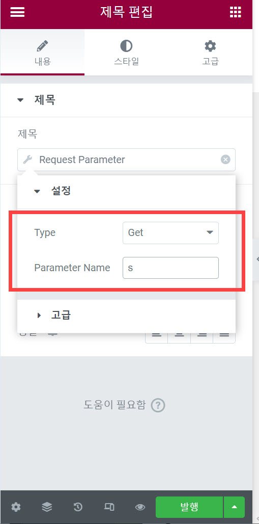 8. 제목 설정에서 Type에 Get을, Parameter Name에 s를 입력합니다.