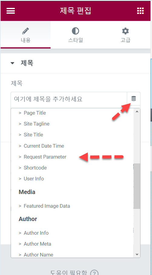 7. 왼쪽 패널의 제목 편집에서 "여기에 제목을 추가하세요" 옆의 아이콘을 클릭하고 "Request Parameter"를 선택합니다.