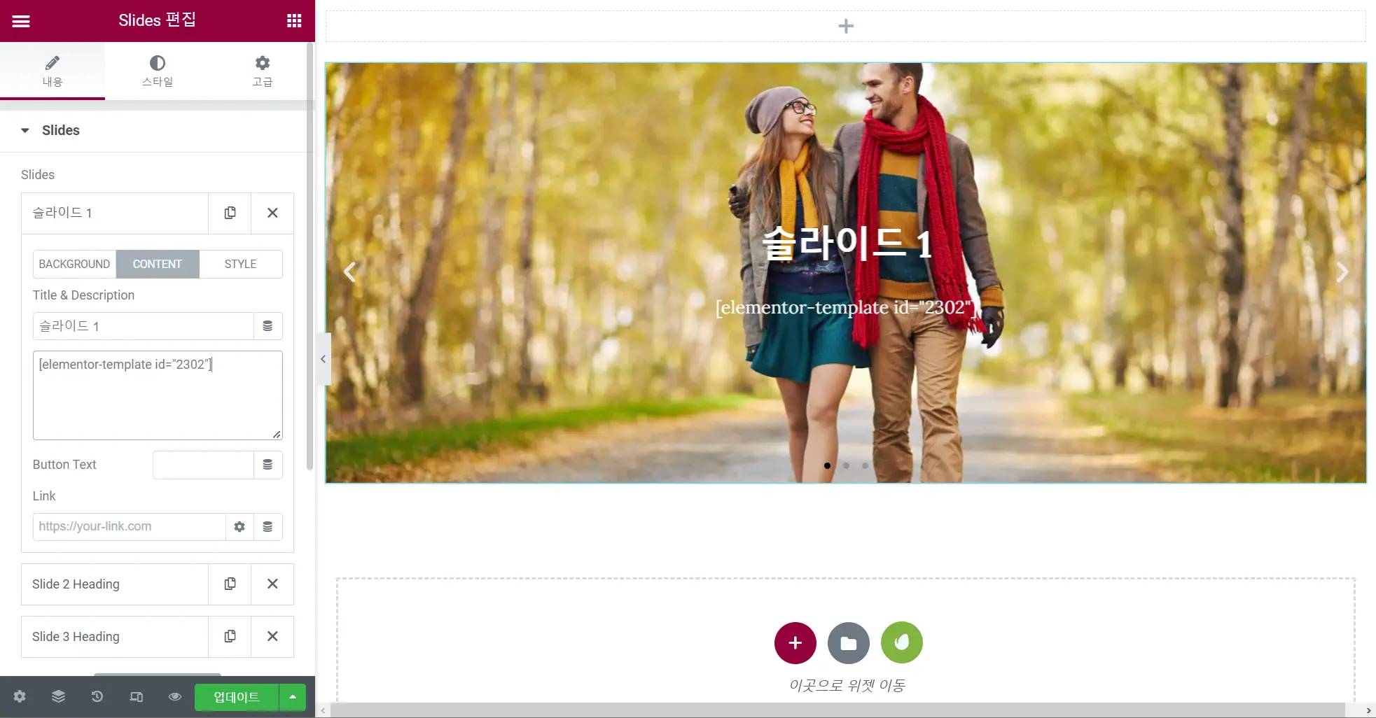 엘리멘터 Slides 위젯에서는 버튼이 하나만 지원되지만, 두 개 이상의 버튼을 표시하려는 경우 여러 개의 버튼을 템플릿으로 만든 다음, 숏코드로 입력할 수 있습니다.
