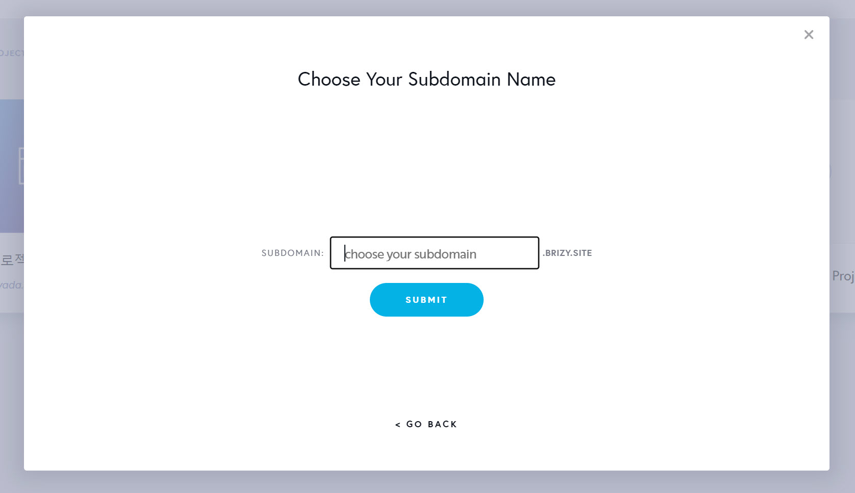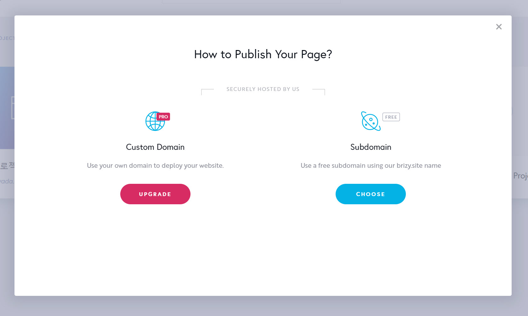 유료 버전에서는 Custom Domain을 선택하여 커스텀 도메인을 지정할 수 있습니다. 무료 버전에서는 Subdomain을 선택하여 brizy 서브도메인을 지정할 수 있습니다.