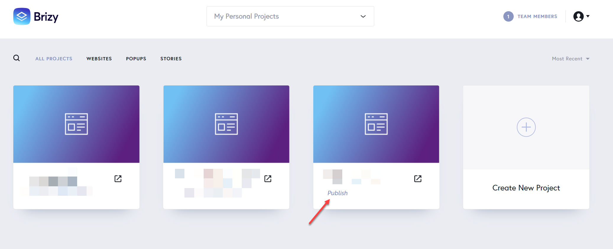 1. Brizy Cloud에 가입한 후에 Create New Project를 클릭하여 새 프로젝트 만들기를 시작할 수 있습니다.