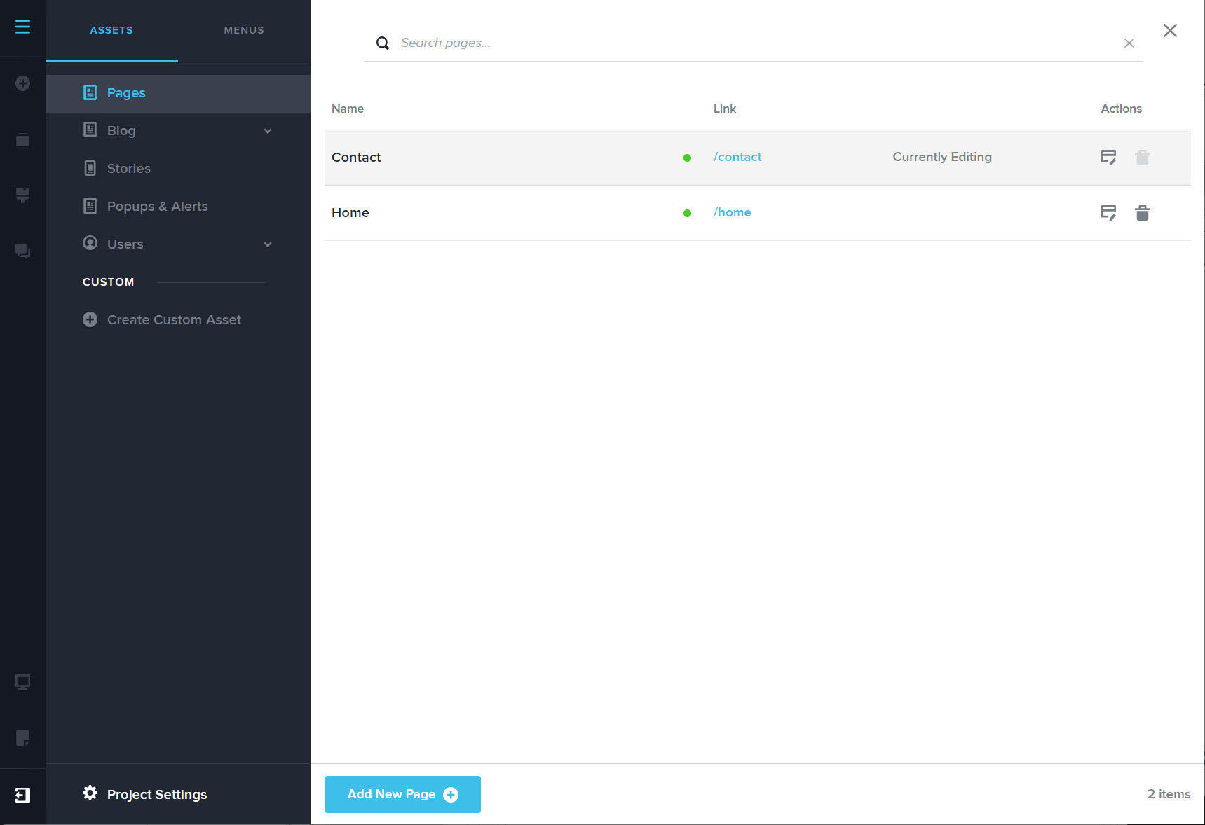 8. 왼쪽 상단의 3개의 줄 모양의 아이콘을 클릭하면 페이지, 블로그 스토리 등의 자산을 확인할 수 있습니다. Pages를 클릭하면 현재 생성되어 있는 페이지들이 나열되어 있습니다. 여기에서 새 페이지를 추가할 수 있습니다.