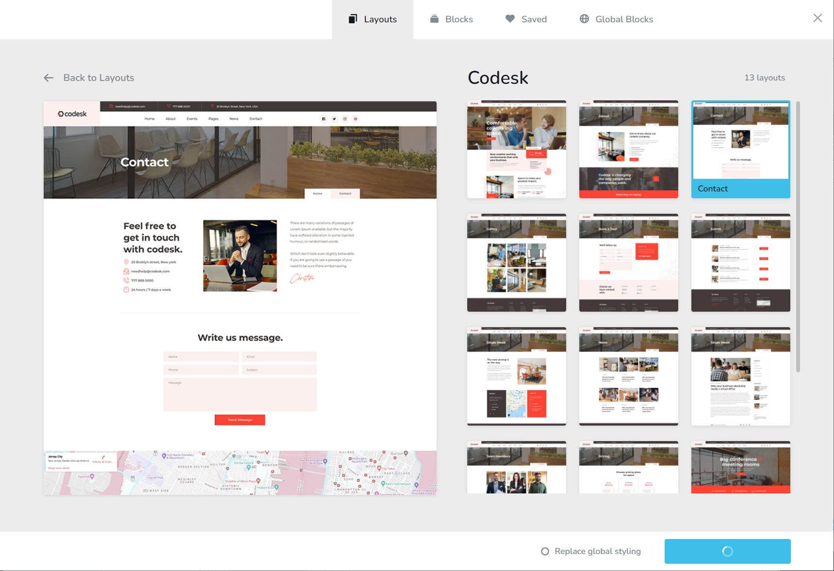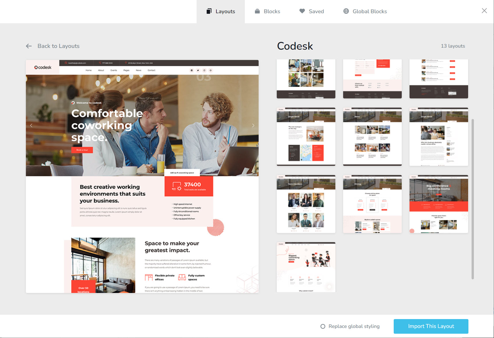 5. Layouts 탭에서 레이아웃 템플릿을 로드할 수 있습니다. 레이아웃은 자체로 하나의 랜딩 페이지로 활용할 수 있는 템플릿입니다. 워드프레스의 아바다, 엔폴드 테마 등의 데모에 해당한다고 생각할 수 있지만, 이러한 테마에서는 사이트 전체에 적용되지만, Brizy Cloud는 페이지에만 적용되며, 여러 개의 레이아웃을 한 페이지에서 로드할 수도 있습니다.
