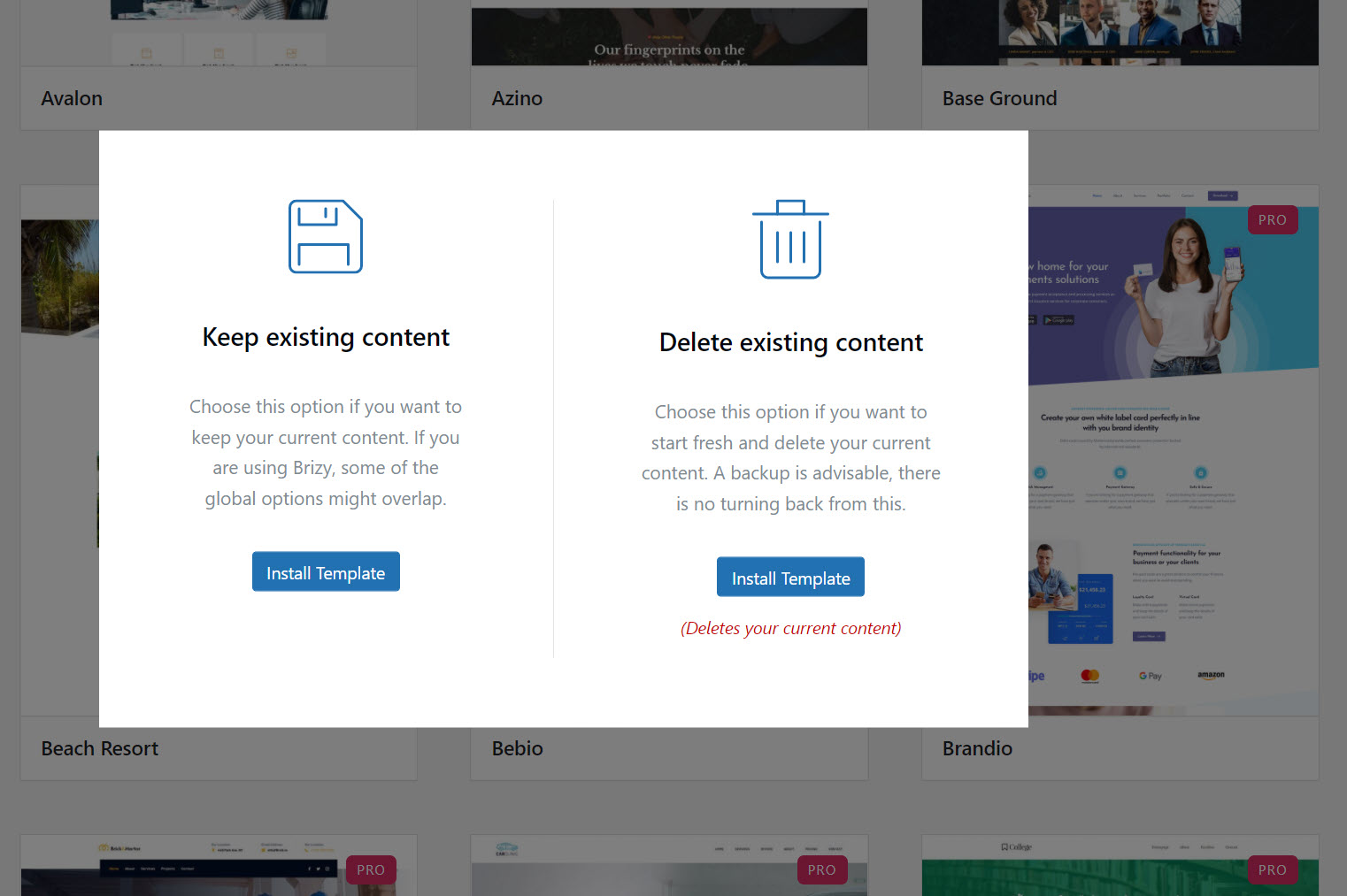 기존 콘텐츠를 유지하려면 Keep existing content 아래의 Install Template 버튼을 클릭하고, 기존 콘텐츠를 삭제하려는 경우 Delete exisiting content 아래의 Install Template 버튼을 클릭합니다.