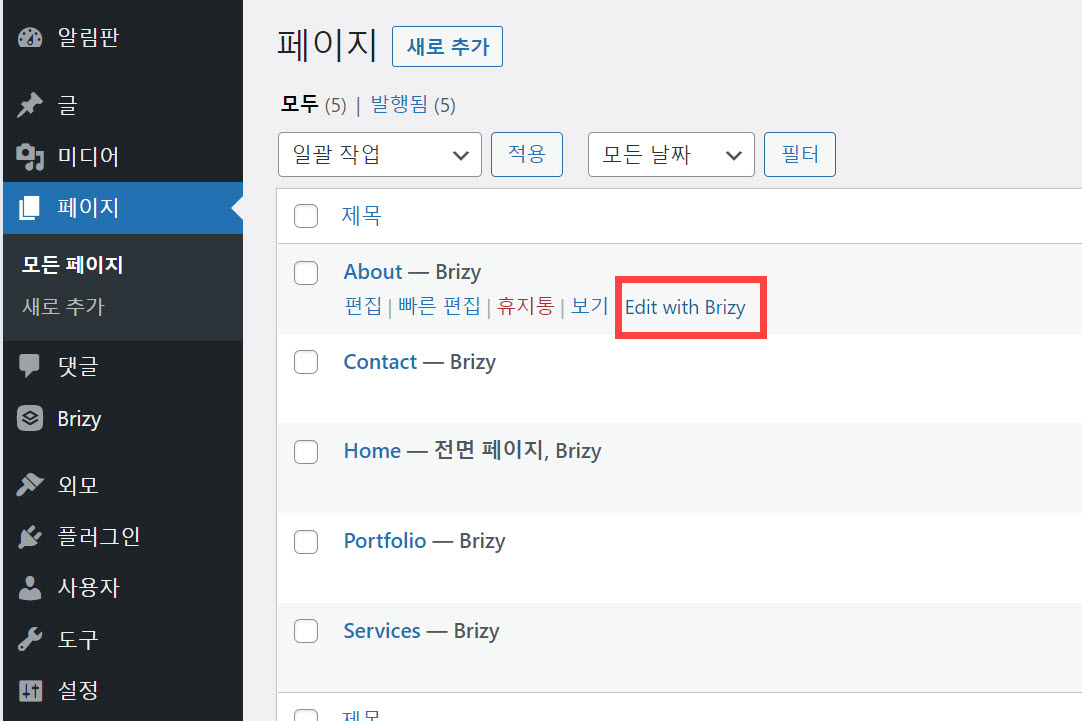페이지를 편집하려면 워드프레스 대시보드의 페이지 > 모든 페이지로 이동하여 편집을 원하는 페이지 이름 위에 마우스를 올리고 Edit with Brizy를 클릭합니다.