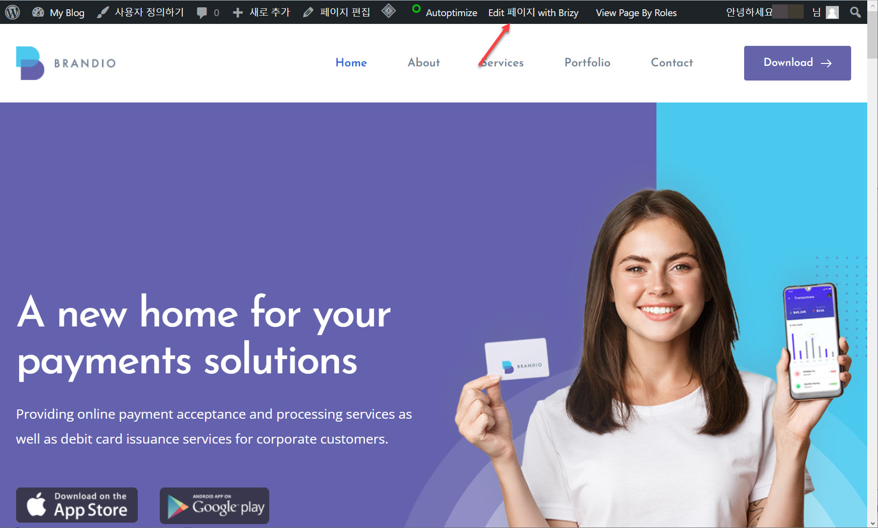 편집할 페이지를 방문한 다음, 상단 툴바의 Edit 페이지 with Brizy를 클릭합니다.