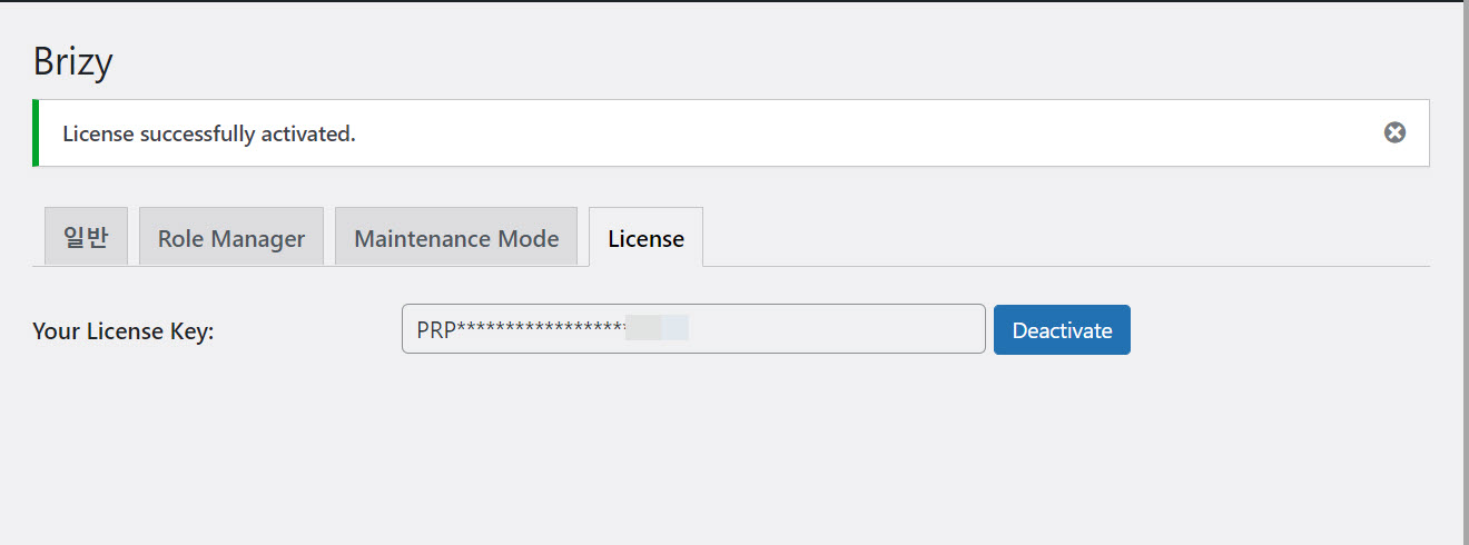 Brizy > 설정 > License 탭에서 Your License Key 필드에 라이선스 키를 입력하고 Activate 버튼을 눌러 라이선스를 등록할 수 있습니다.
