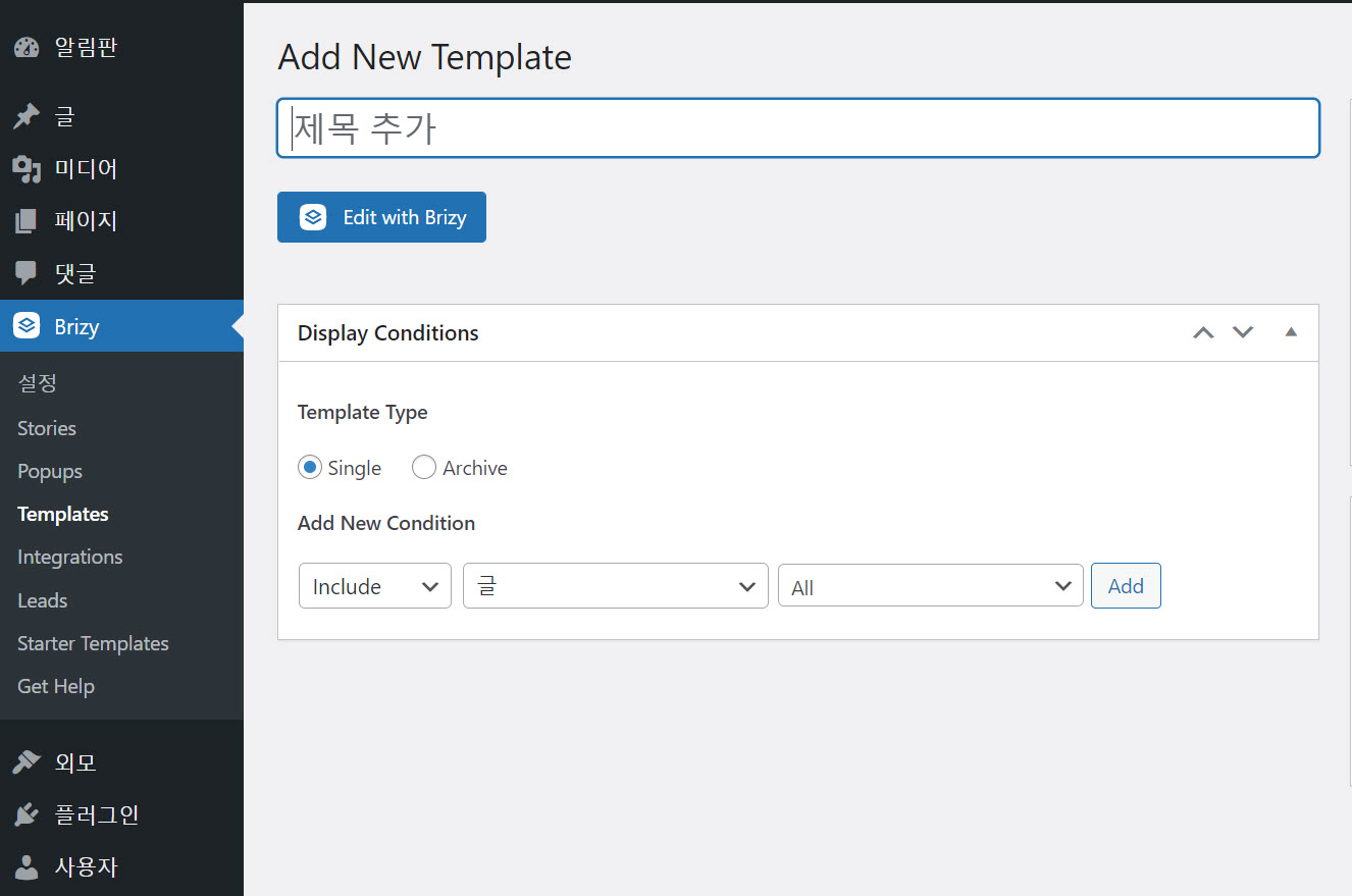 Brizy > Templates에서 템플릿을 만들어서 특정 페이지나 글, 아카이브 페이지에 표시되도록 설정할 수 있습니다.