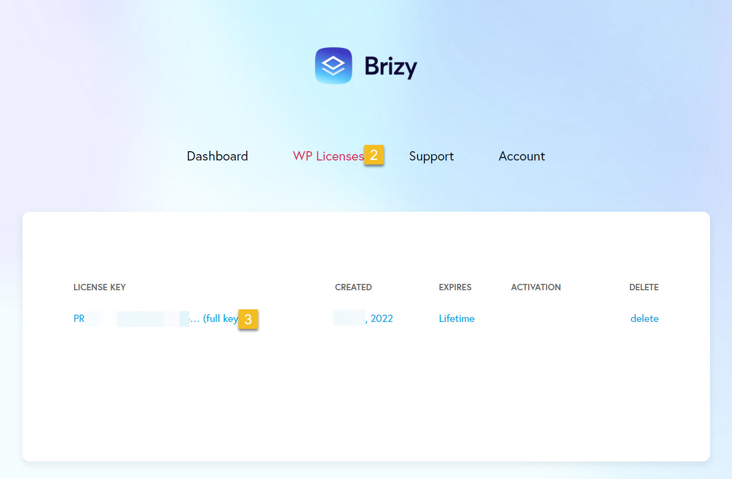 라이선스 키는 Brizy 사이트의 WP Licenses 메뉴에서 확인할 수 있습니다. License Key 아래에 나와 있는 키를 클릭하면 복사할 수 있습니다.