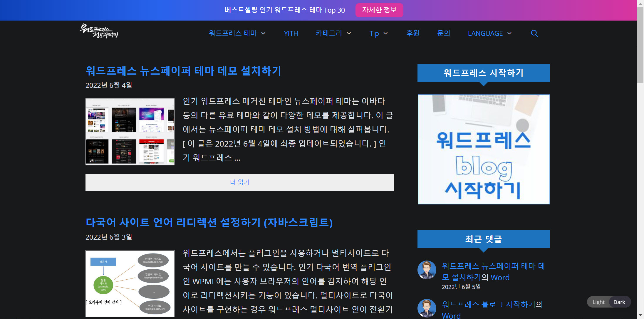 제 워드프레스 블로그에도 다크모드로 전환하는 버튼을 표시했습니다. 이 티스토리 블로그처럼 강제로 다크모드로 시작하도록 할지 고민하고 있습니다.