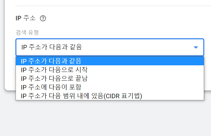 검색 유형에서는 IP 주소가 다음과 같음 외에도 IP 주소 시작 값이나 IP 주소 끝 값 등을 지정할 수도 있습니다.