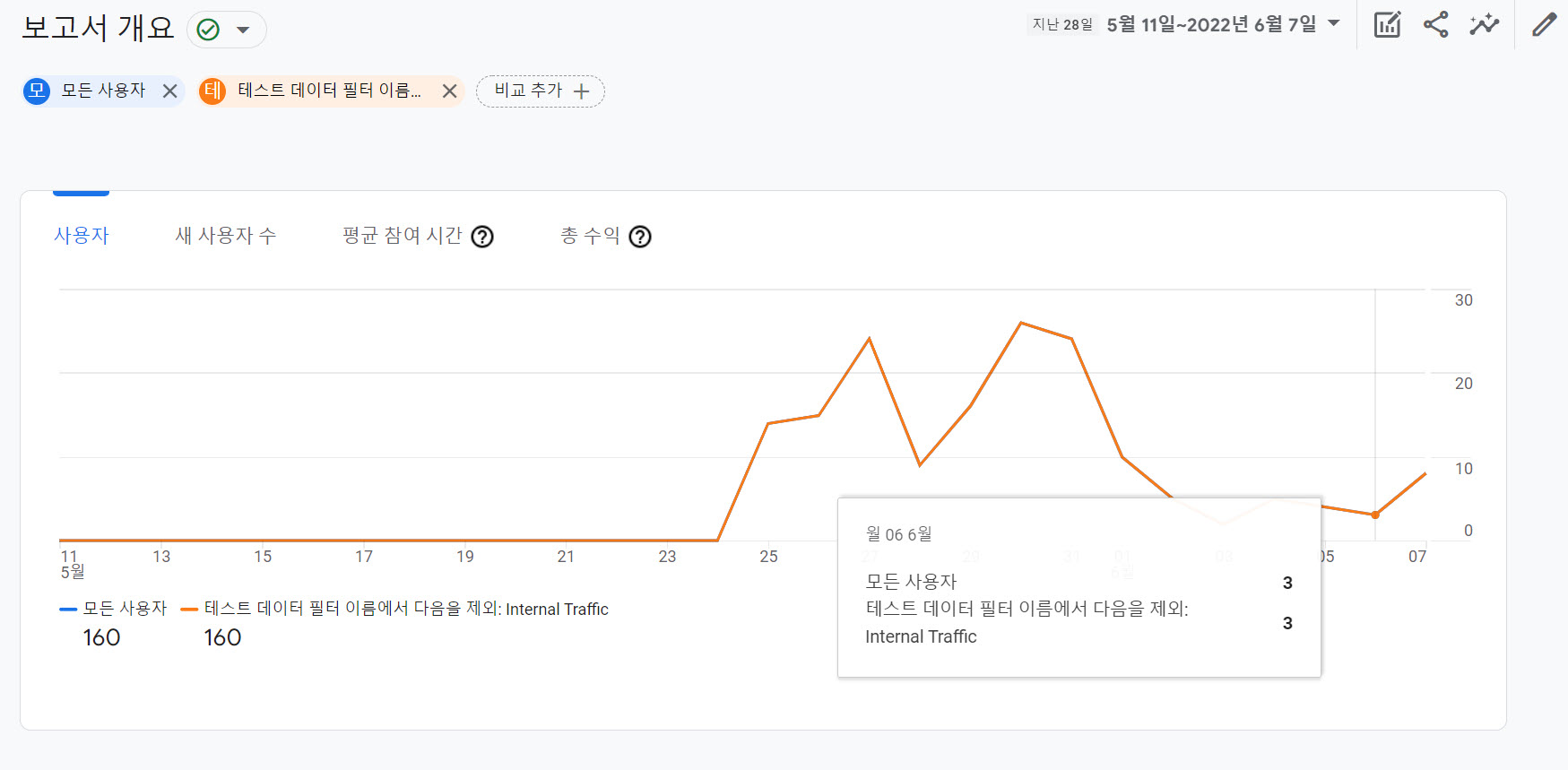4. 새로 고침하면, 이제 "모든 사용자"와 "테스트 데이터 필터 이름..."으로 된 두 가지 데이터 세트가 표시됩니다.
